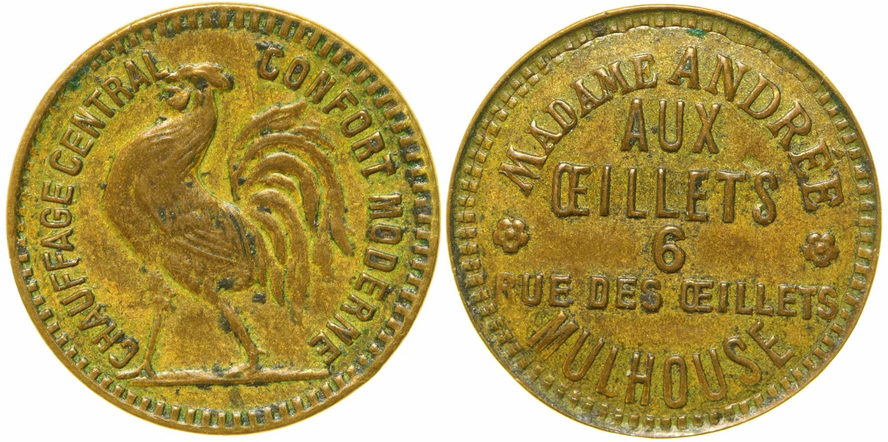Obv.: Madame Andree / Aux / Oeillets / 6 / Rue Des Oeillets / Mulhouse; Rev.: Confort Moderne / Chauffage Central. Br., rd., 22 mm. Unlisted in Paynot.