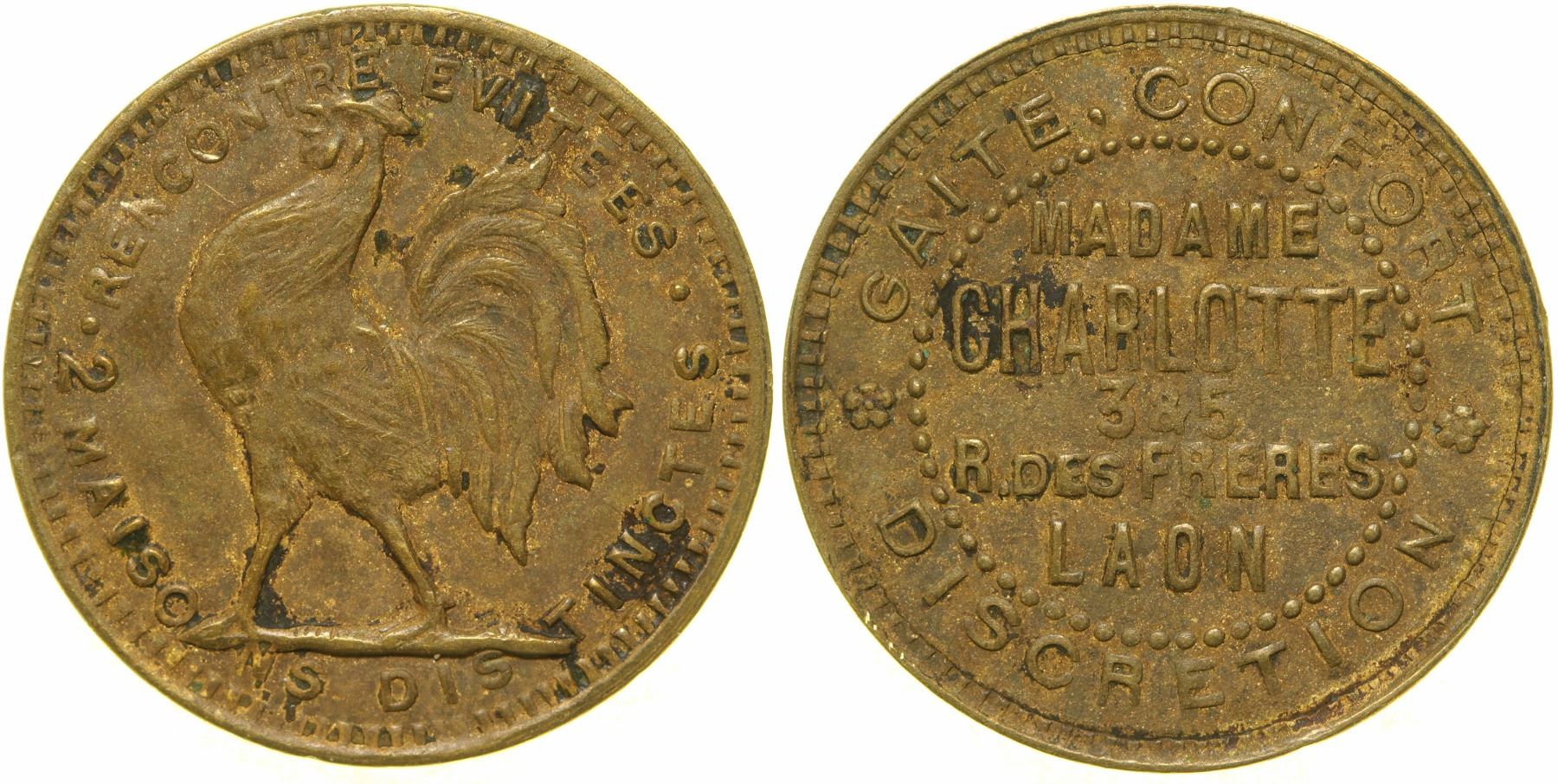 Obv.: Gaite Confort / Madame / Charlotte / 345 / R Des Freres / Laon / Discretion; Rev.: Rencontre eviteees / (rooster) / 2 maisons distinctes. Br., rd., 22 mm.