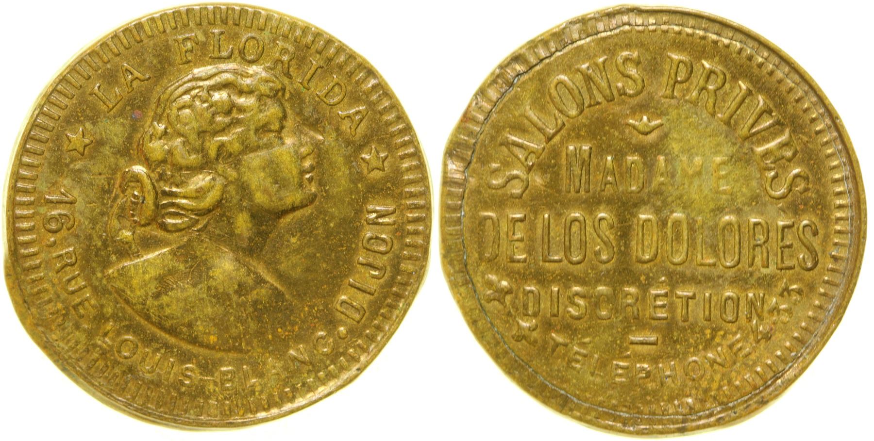 Obv.: Salons PRives / Madame / De Los Dolores /Discretion / Telephone 4.33; Rev.: La Florida / 16 Rue Louis Blanc. Dijon. Br. rd., 22 mm.