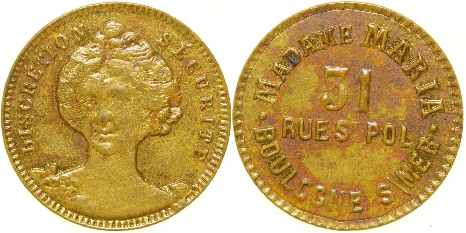 Obv.: Madame Maria / 31 / Rue S Pol / Boulogne S/ Mer; Rev.: Discretion /Securite. 21 mm.