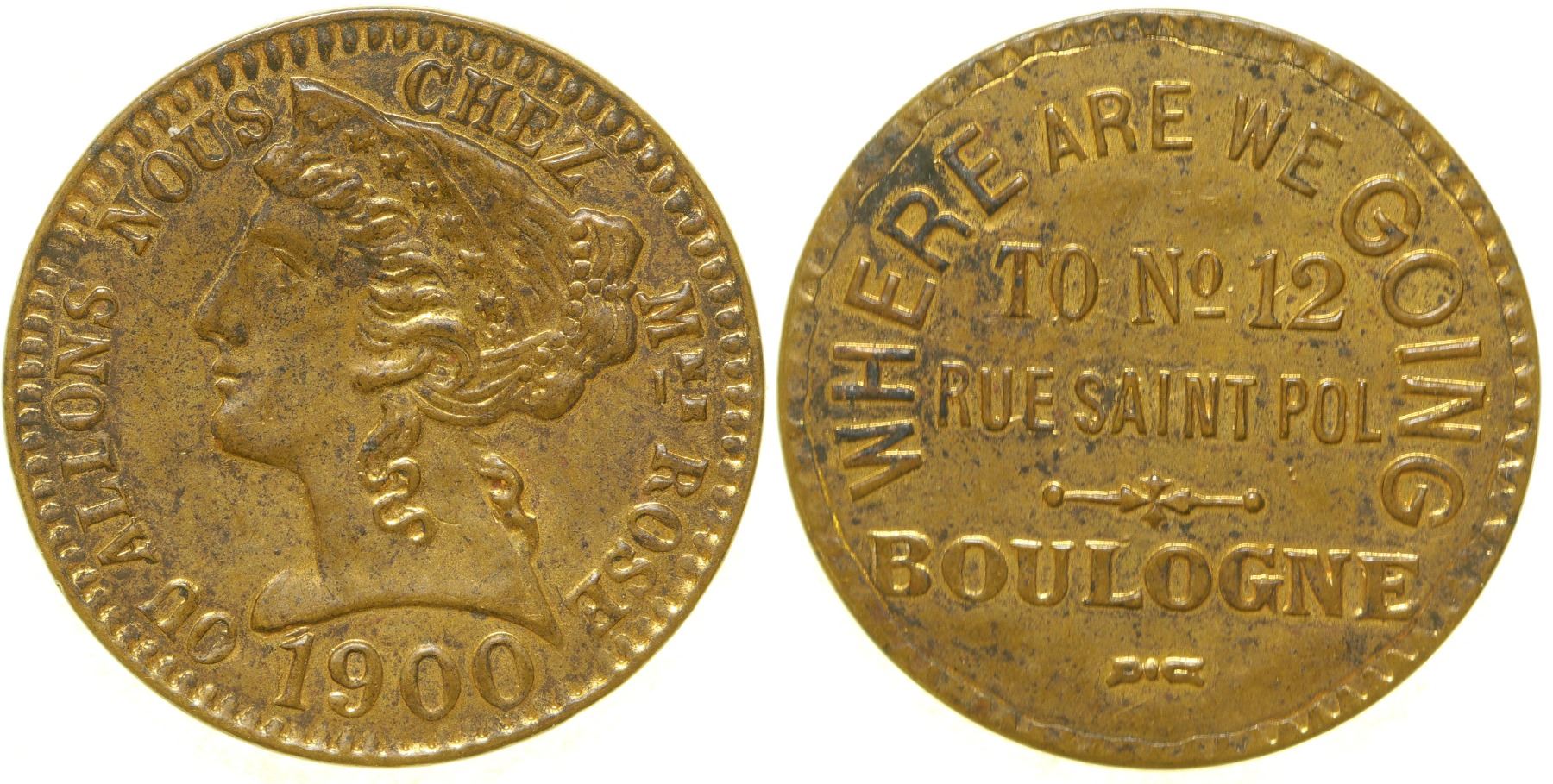 Obv.: U Allons Nous Chez M Rose / 1900; Rev.: Where Are We Going/ To No 12 / Rue Saint Pol / Boulogne. Br. rd., 21 mm. Great piece, bi-lingual, possibly handed out at ports.