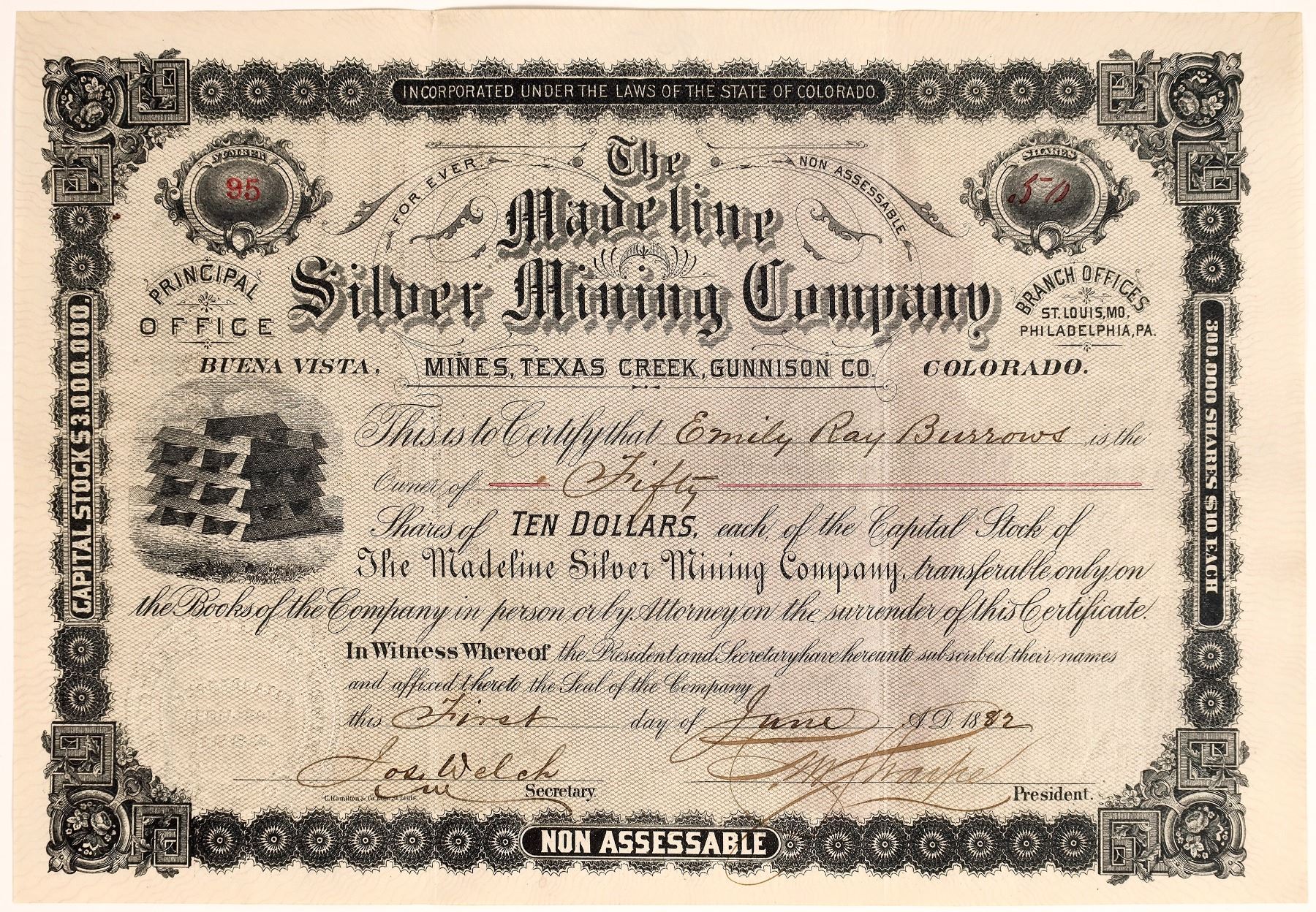 Ultra rare. Location printed on certificate: Mines at Texas Creek, Gunnison Co. Principal Office at Buena Vista. Inc. in Colorado. No. 95, issued for 50 shares to Emily Ray Burrows on June 1, 1882. Secretary, Joseph Welch. Signed by Welch and the company president, Sharpe. Not cancelled. Vignette of stacked bullion bars (left). Rest of certificate is very ornate with a shiny background. According to 1885 Report of the Mint, the Madeline was worked with good results in the summer with two men constantly employed and ore shipped. One very small rip upper left. Otherwise quite spectacular to the TEN on reverse.