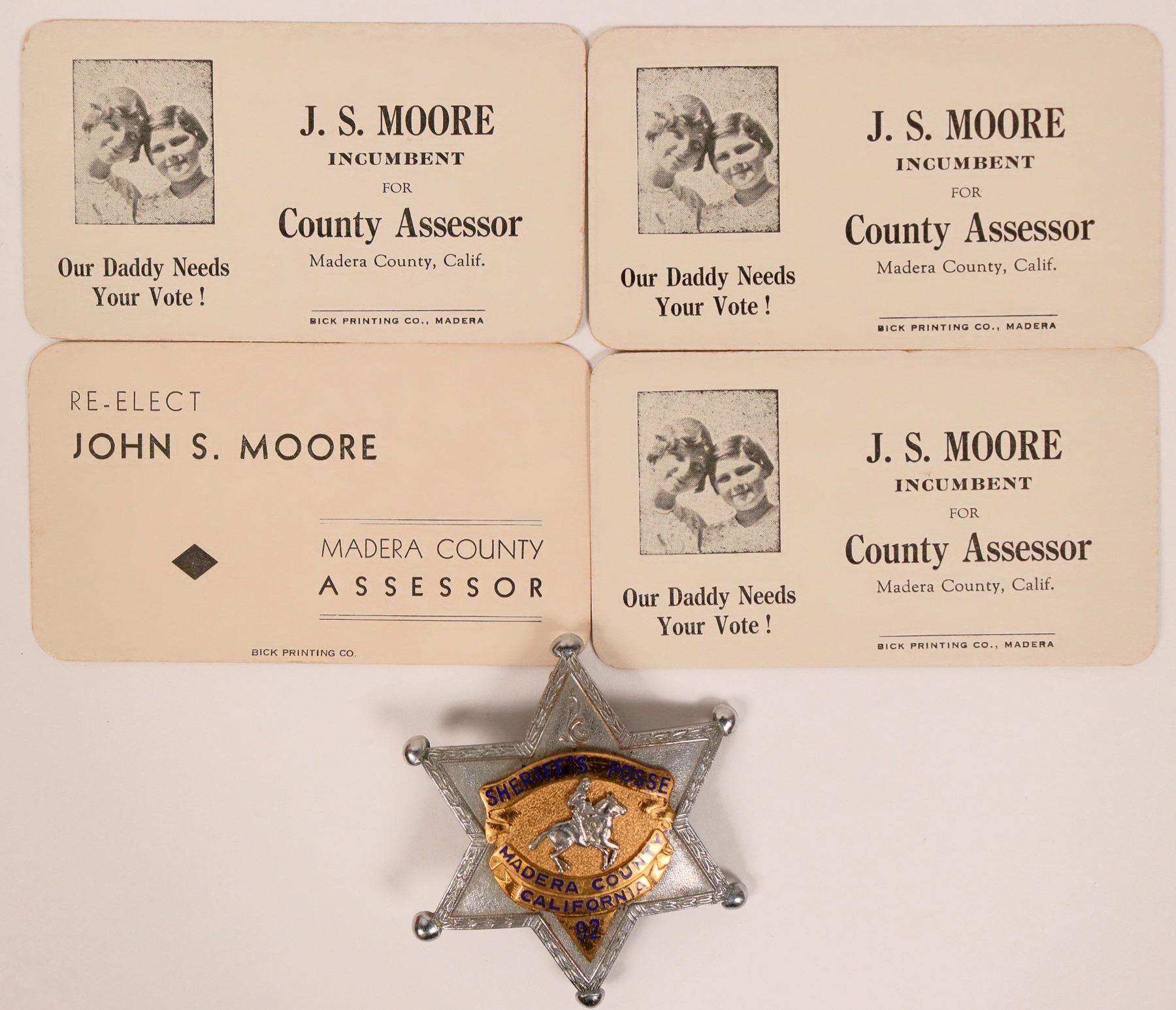 Six pointed star badge with blue enamel : "Sheriff's Posse/ Madera County / California / 92. Also 4 business cards "Our Daddy Needs Your Vote! J. S. Moore / Incumbent / for / County Assessor / Madera County, Calif."