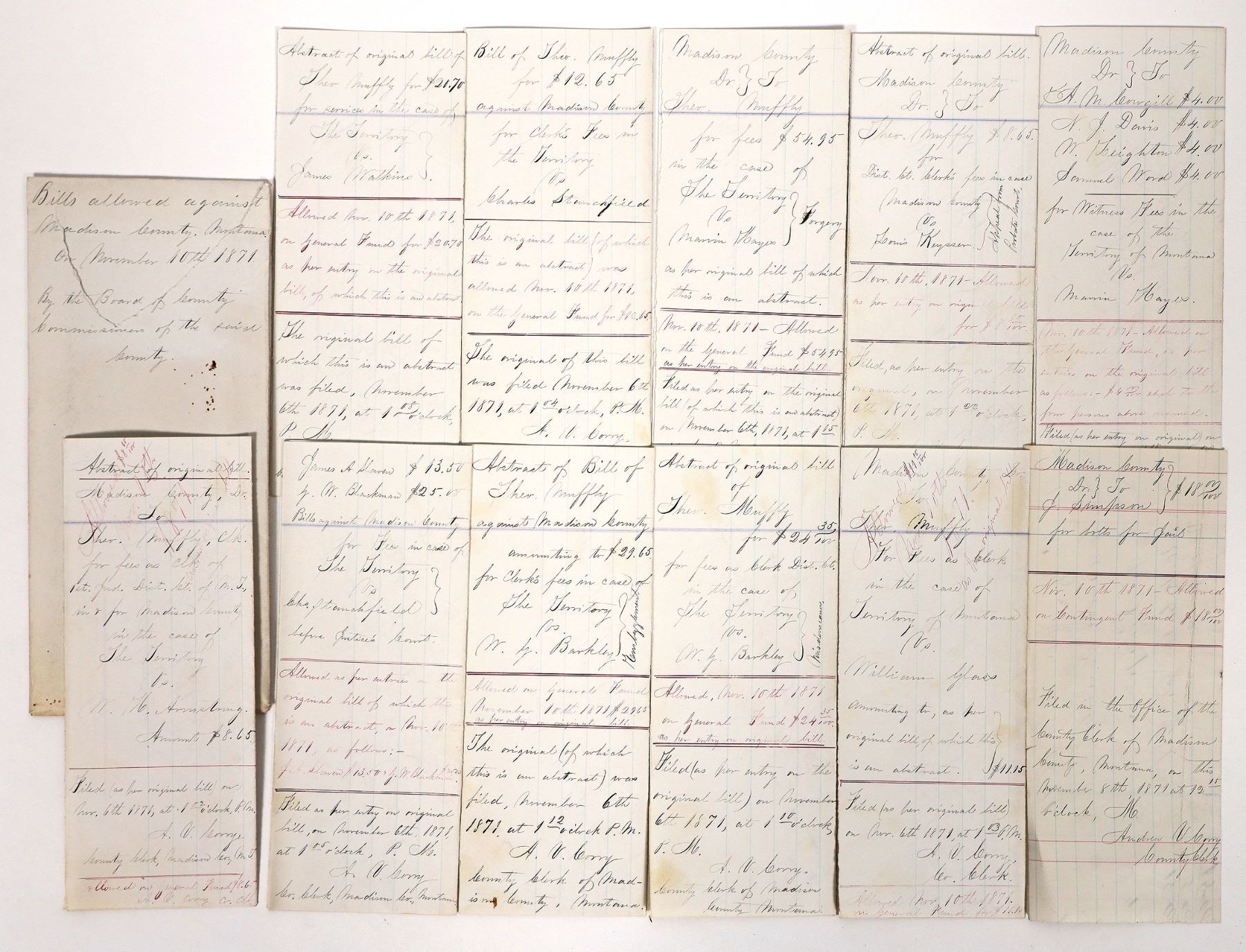 12 1871 legal documents for bills allowed in Madison County. Witness fees, trial case fees, clerks fees etc.