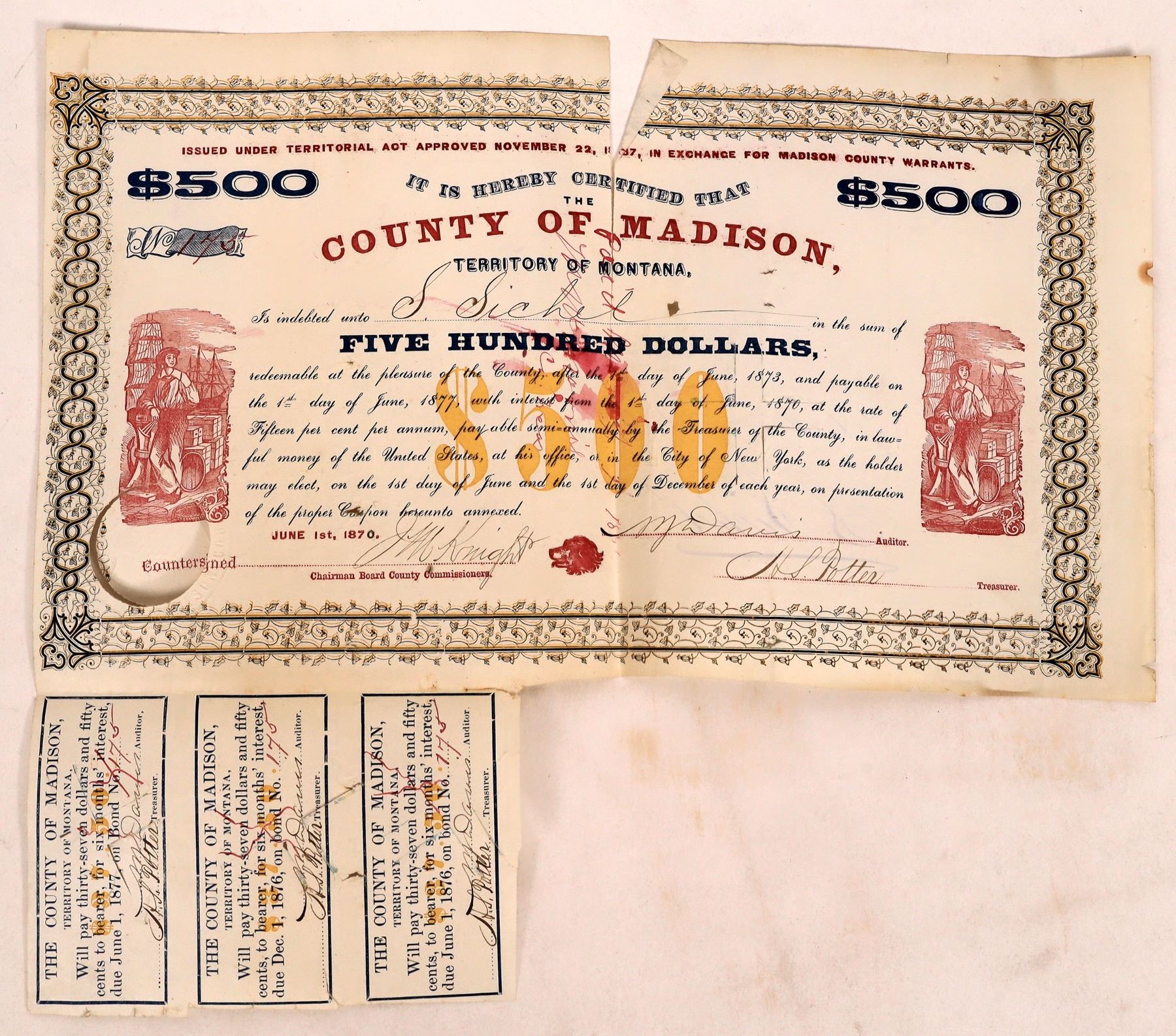 1870 bond from Madison County, MT with 3 attached coupons and red sailor vignette. 3.5" center tear, dog ear and right edge wear. Sold as is.