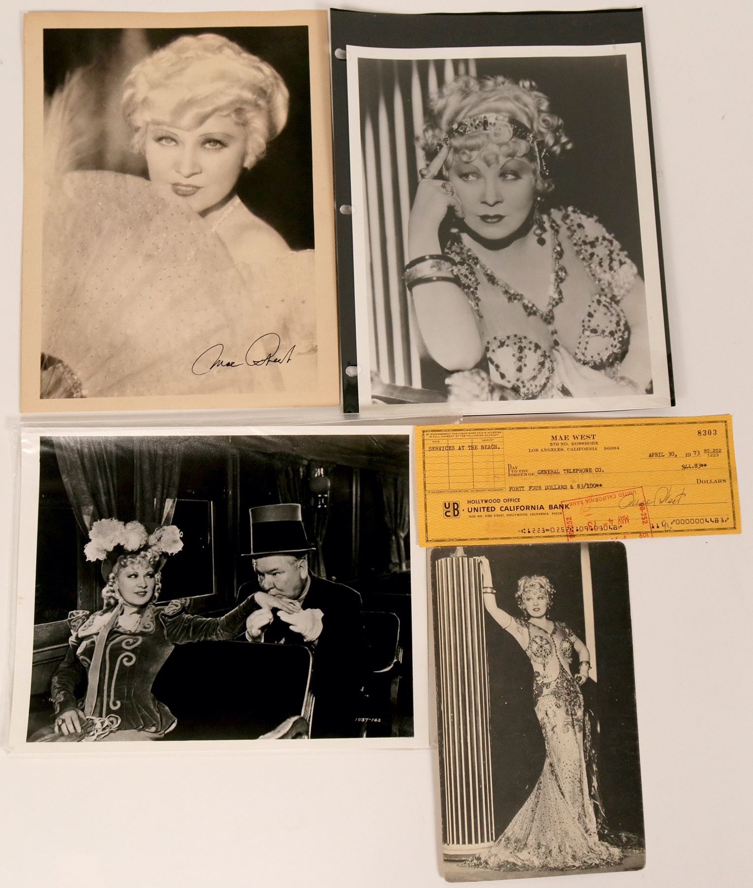 This lot includes a check autographed by actress Mae West, as well as photos (one with a pre-printed autograph only). The check is #8303 for $44.83 to General Telephone Co.m signed by West. West was a controversial actress and author in the 20's and 30's and starred with such movie icons as Cary Grant and W.C. Fields.