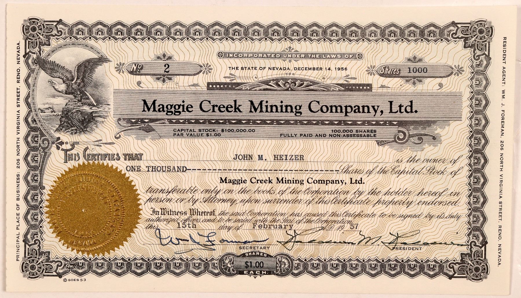FH says this was the first of the low-grade open pit gold mines in Nevada and the first in the Carlin trend. Bought by Newmont. Very important! Inc. in Nevada, 1956. Low stock number 2, issued to John M. Heizer for 1,000 shares on Feb. 15th, 1957. Signed by the president and secretary (illegible). Not cancelled. Black border and print, gold seal, and eagle vignette. Printed by Goes. Folds, clean. 5.75 x 10" Please see our write-up on Heizer in the catalog. The Maggie Creek Mining District is located 7 miles NW of Carlin, first organized in the 1870s. Huge producer!Heizer Estate