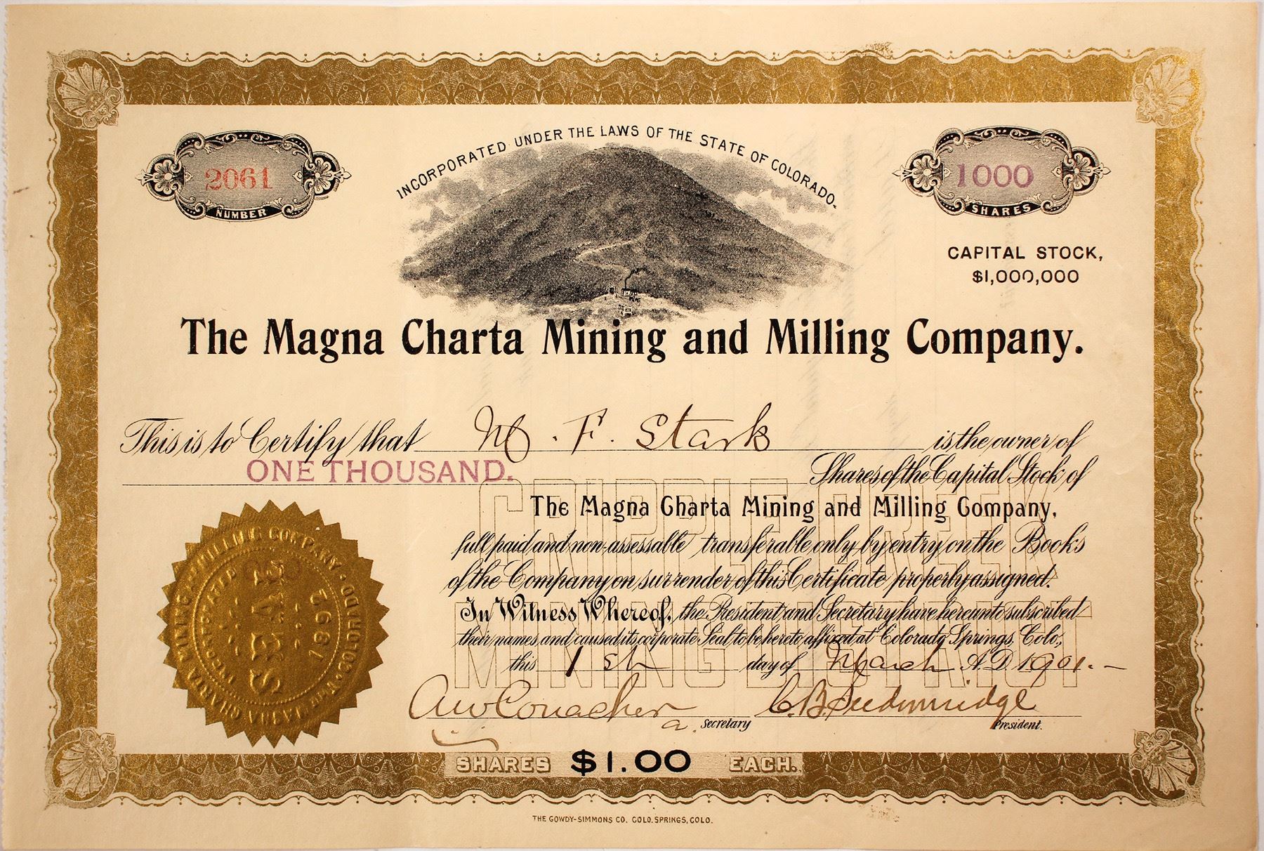 Inc. in Colorado. No. 2061, issued for 1,000 shares to M.F. Stark, company treasurer, on March 1st, 1901. Signed by C.B. Seldomridge, president, and Conacher, asst. secretary. Not cancelled. Gold border and vignette of mountain with mine on it. Nice condition. Printed by Gowdy-Simmons Co., Colorado Springs. Owned the Magna Charta, Quartzite, and Annex on Ironclad Hill; and the North Star Placer and JBS Lode on Mineral Hill. Seldomridge is a name familiar to Cripple Creek historians. J.F. Seldomridge operated a grain business in Colorado Springs with his two sons (C.B. and Harry H.). It was this business that Bob Womack put a large piece of ore on display that got noticed by Ed De La Vergne, mineralogist. He identified it as high-grade gold ore and the rush to Cripple Creek began!