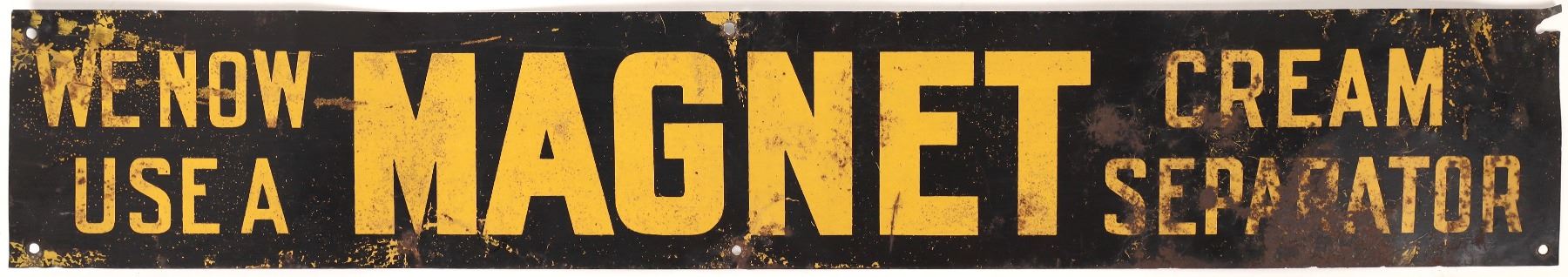 Metal ad sign for Magnet Cream Separator. Sign measures 4"x 23" and hasa tear on right corner nail hole, Also has some rust issues, but not a lot. 1900s