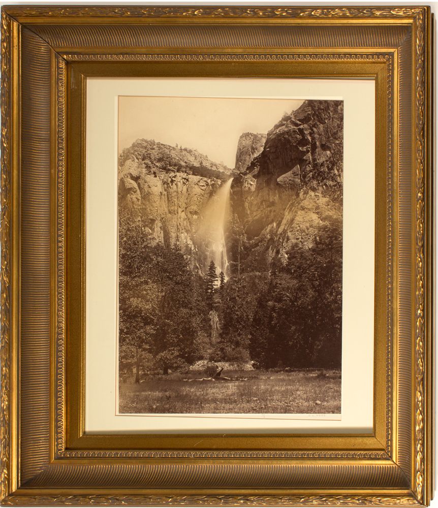 This is a beautiful black and white photograph taken of Bridal Veil Fall by one of Yosemite’s earliest, if not first photographer, Charles Leander Weed. The photo is framed and matted, measuring 21”x 15” and 26”x 32” framed. The fullness of the fall would indicate that the picture was probably taken in late spring or early summer. Weed was working in Sacramento when entrepreneur James Hudson, who had first visited Yosemite in 1855, invited Weed along four years later. This is a majestic view of the fall, very sharp and mounted on sturdy poster board and then the matting. Frame is in older shape but has no severe damage. This is a rare chance to own a unique black and white photo of a Yosemite landmark done by someone other than Ansel Adams.