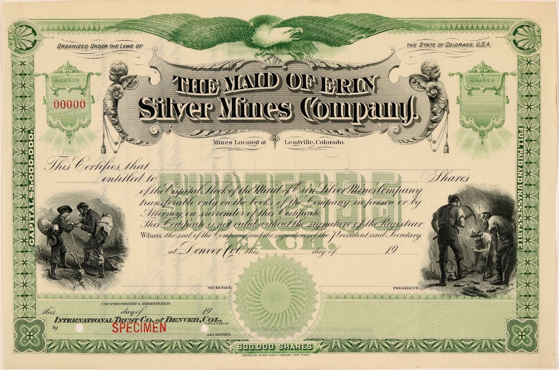 Beautiful specimen from The Maid of Erin Silver Mines Company. The company's mines were at Leadville, Colorado. Two nice mining vignettes. Nice engraving by ABN, New York. "SPECIMEN" stamped in red at lower left. Two hole punches there as well. VF.