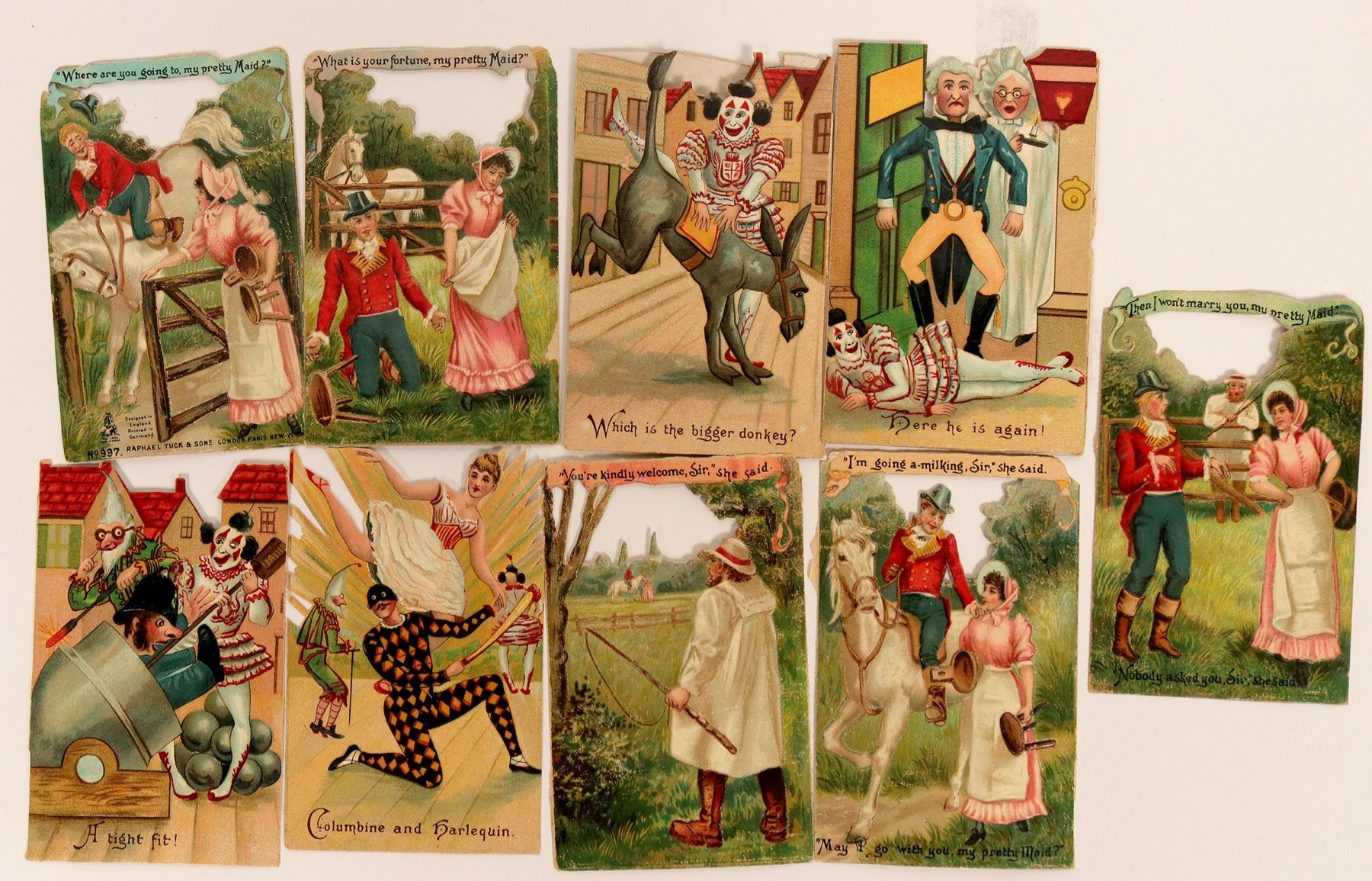 Collection of nine extra rare, very colorful and whimsical advertisements for Maier & Zobelein Brewery in Los Angeles. The approx. 3 x 5 inch high gloss cards by Raphael Tuck & Sons London, Paris, New York, were designed in England and printed in Germany. Maier & Zobelein Brewery opened in 1882 and closed in 1907. In 1874, the Philadelphia Brew House Brewery was established near Union Station. That same year German immigrants Joseph Maier and George Zobelein bought the brewery and renamed it “Maier & Zobelein Brewery.” Then in 1907, Zobelein purchased Maier & Zobelein Brewery, and renamed it the LA Brewing Brand Beer. Prohibition made breweries go dark from 1919-1933. In 1948, LA Brewing Co. was sold to Pabst, along with Eastside Brand Beer.