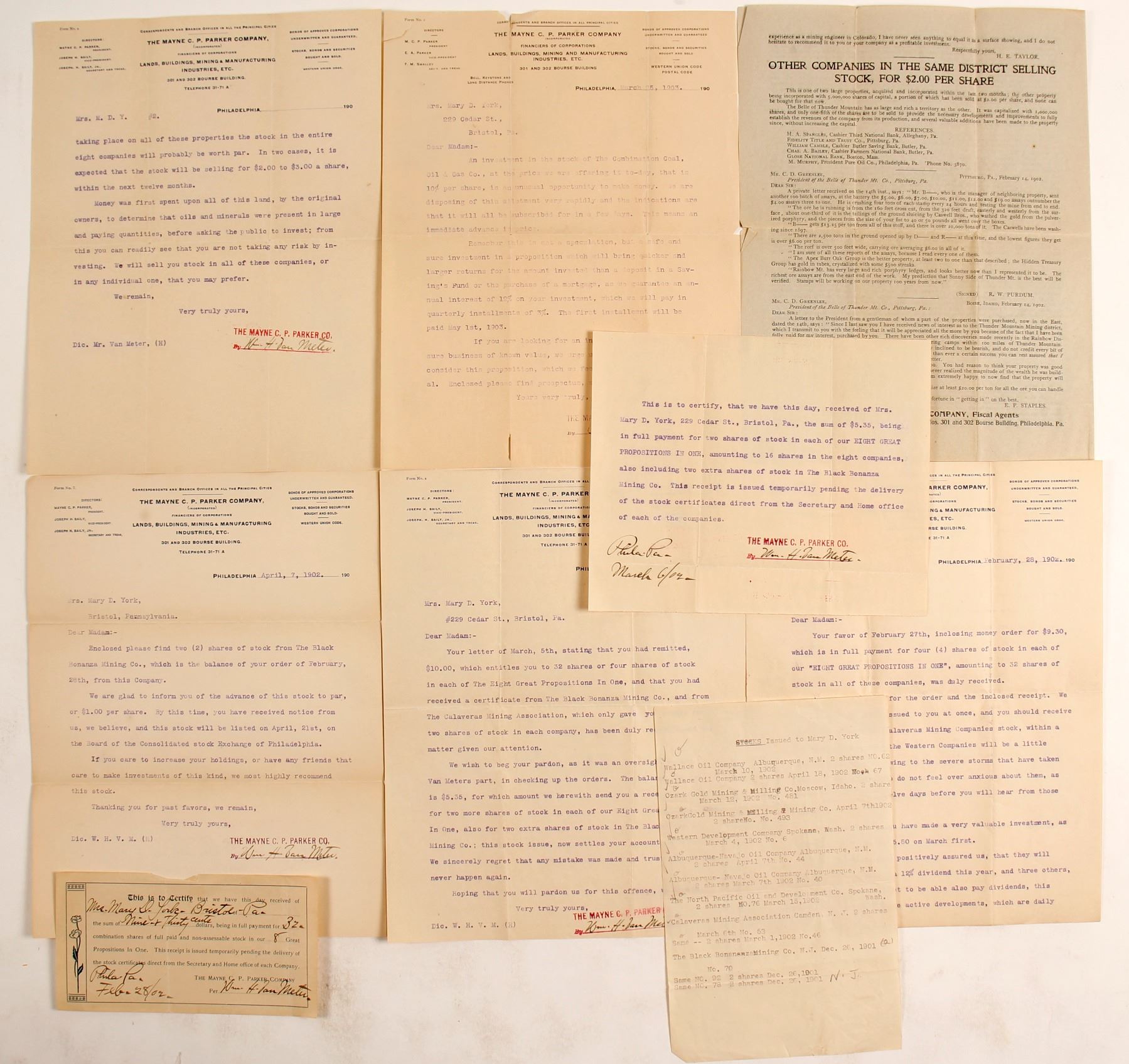 Group of correspondence, about 8pcs, from the Mayne C. Parker Co. of Philadelphia soliciting the sale of stock in various mining and oil companies. This was a classic method of selling to non-technical mom & pop investors, which usually ended up in a scam.