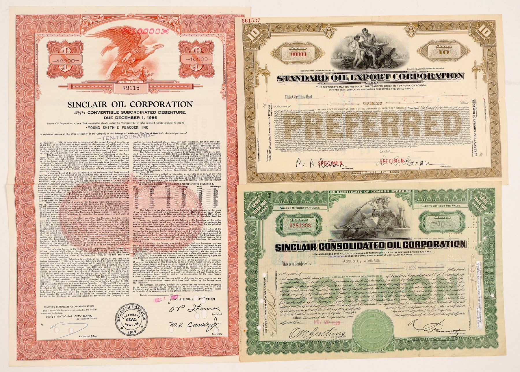 Lot of three. 1) Standard Oil Export Corporation. Specimen for preferred stock. Interesting vignette of allegorical man holding a ocean going vessel while nude son looks on. 2) Sinclair Consolidated Oil Corporation. # 281298 for 10 shares. Auto signed. Cancelled. 3) Sinclair Oil Corporation. 4 3/8% convertible subordinated debenture. $10,000. Number R9115. Cancelled. Ken Prag Collection