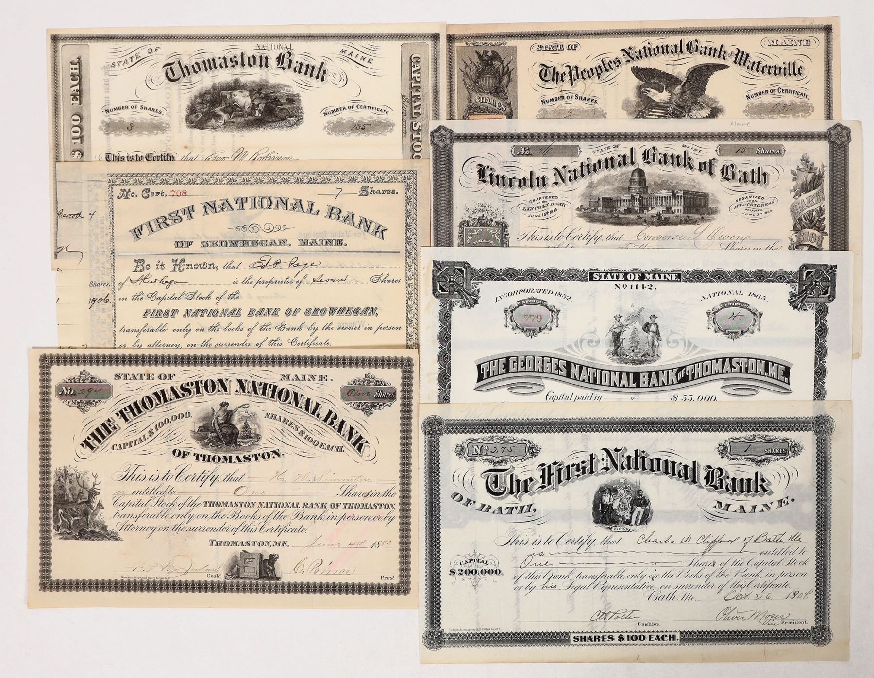 Issued-1867 and 1883 Thomaston National Bank, 1919 Georges National of Thomaston, 1906 First National of Skohegan, 1886 Peoples National of Waterville, 1865 Lincoln National of Bath, 1904 First National of Bath.
