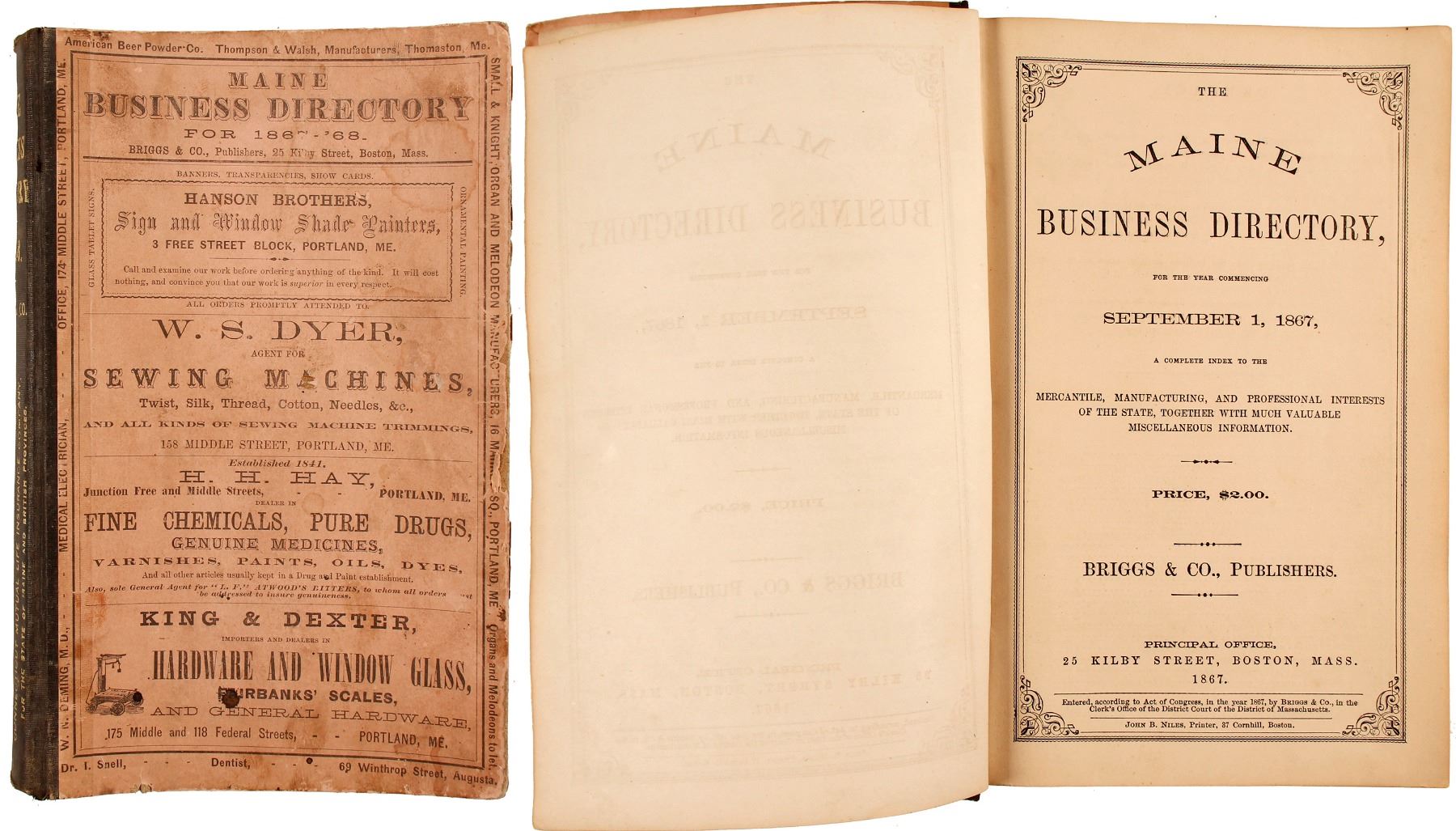 The Maine Business Directory for September 1, 1867. by Briggs & Co., Boston. 280 pages plus abs, all original board is fine, slight warping of boards, otherwise fine Maine Fred Holabird Collection