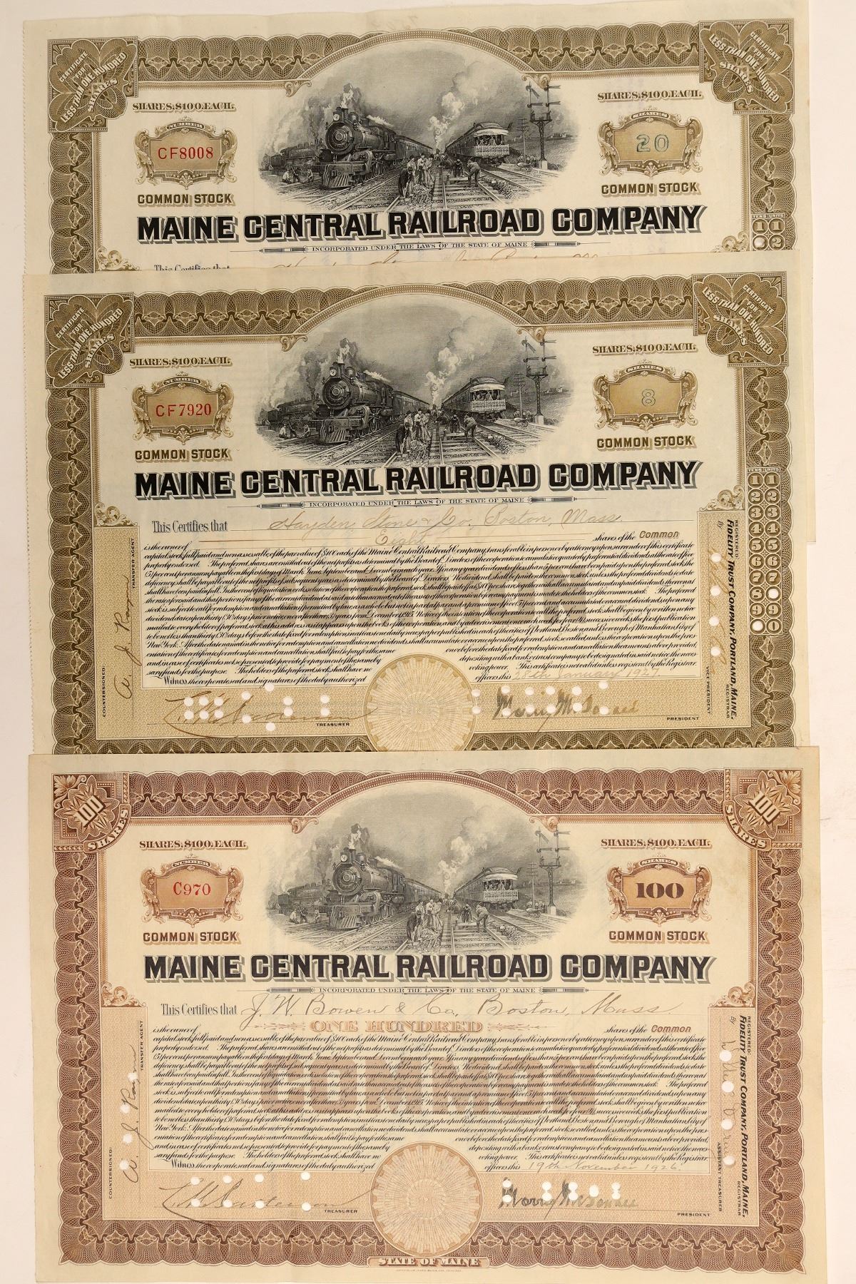 3 cancelled common stock certificates for Main Central Railroad Co. Boston, MA for $100 each with train yard vignette on top center, raised brown seal and brown border, countersigned and registered. Incorporated state of Maine. Printed: American Bank Note Co., Boston. Incorporated under the laws of the State of Maine. 1) Cancelled 100 shares certificate #C970 dated Nov. 19, 1926 issued to J. W. Bowen & Co., Assigned to Percy V. Hill on Dec 6, 1926. 2) Cancelled 8 shares certificate #CF7920 dated Jan 28, 1927 issued to Hayden, Stone & Co., Boston, MA Assigned to Frank C. Deering, Saco, Maine on Feb 21, 1927. 3) Cancelled 20 shares certificate CF8008 dated Feb. 10, 1927 issued to Hayden, Stone & Co., Boston, MA . Assigned Lloyd B. Fenderson on Feb 24, 1927.