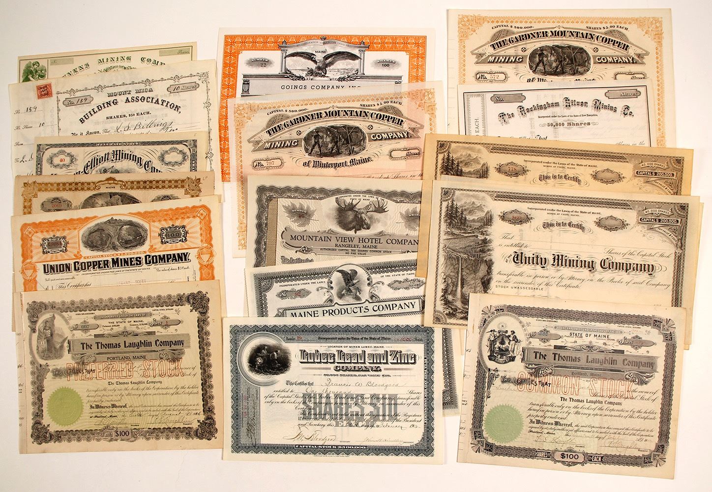 Union Copper Mines, Mountain View Hotel, Lubec Lead and Zinc, Thomas Lauglin, Rockingham Silver Mining, Unity Mining, Maine Products, Gardner Mountain Copper Mining, Goings Co., Siemans Mining, Lewiston & Auburn, Harvey-Elliot Mining, Mount Mica Building Assoc. Date: Location: Maine HWAC# 56173
