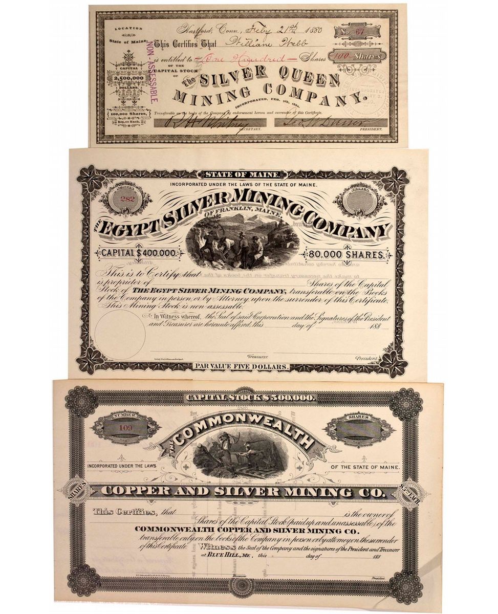 Lot of 3. 1) Silver Queen Mining Company. Incorporated in Maine. æNo. 67 issued to William Webb on February 21, 1880 for 100 shares. æSigned by secretary R.A. Whitney and president George W. Dresser. Some wear, creases present from being folded. 9 _î x 4 _î. 2) Egypt Silver Mining Company. Incorporated in Maine. No. 282 Unissued. æLittle wear. 10 _î x 7î. 3) Commonwealth Copper and Silver Mining Company. Incorporated in Maine. No. 109 unissued. 11 _îx 6 _î. Date c1880 , ME hwac 10036