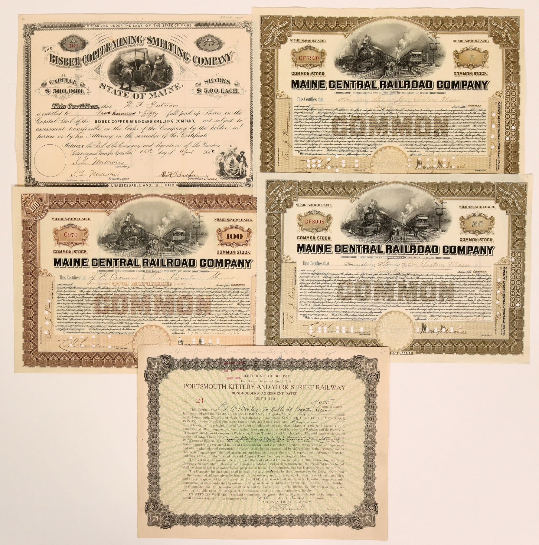 1. State of Main is a big clue. Is this the Bisbee that the town in Arizona is name for? It seems not, DH Bisbee was a native of Maine. As a matter of fact it isn't even an Arizona company! Bisbee was in the mining business, sort of, as the 1880 census ways he is in the explosives business. # 169 for 250 shares to WF Pictman. Singed by SQ Milliken as secretary and transfer agent and DH Bisbee as president and treasurer. Surely a Mom and Pop type organization. Dateline 1880. Underground mining vignette. Arthur & Ronnell of New York printer. Not cancelled. Some staining top Center. 2 vertical folds. Bisbee Copper operated on Blue Hill in Hancock County on the coast of Maine near Mt. Desert Island. Frank Bartlett, state assayer, reporter, "At the present time there are six regular companies at work. Among these may be mentioned the Bisbee, Blue Hill, Doaglass, Atlantic and Stover Hill. These mines are so well known that an extended description of them would be out of place." Ore was shipped to Baltimore for smelting. The ore was such that there was little contaminants to hinder the process. 2. Portsmouth, Kittery and York St. Railway Cert. of Deposit- Unlisted. I/U #24 Ed Bailey $4000 1916 signed by President Smith. "The line from Badgers Island to Kittery Point was opened on August 12, 1897 by the Portsmouth, Kittery, & York Street Railway. 3. 3 cancelled common stock certificates for Main Central Railroad Co. Boston, MA for $100 each with train yard vignette on top center, raised brown seal and brown border, countersigned and registered. Incorporated state of Maine.