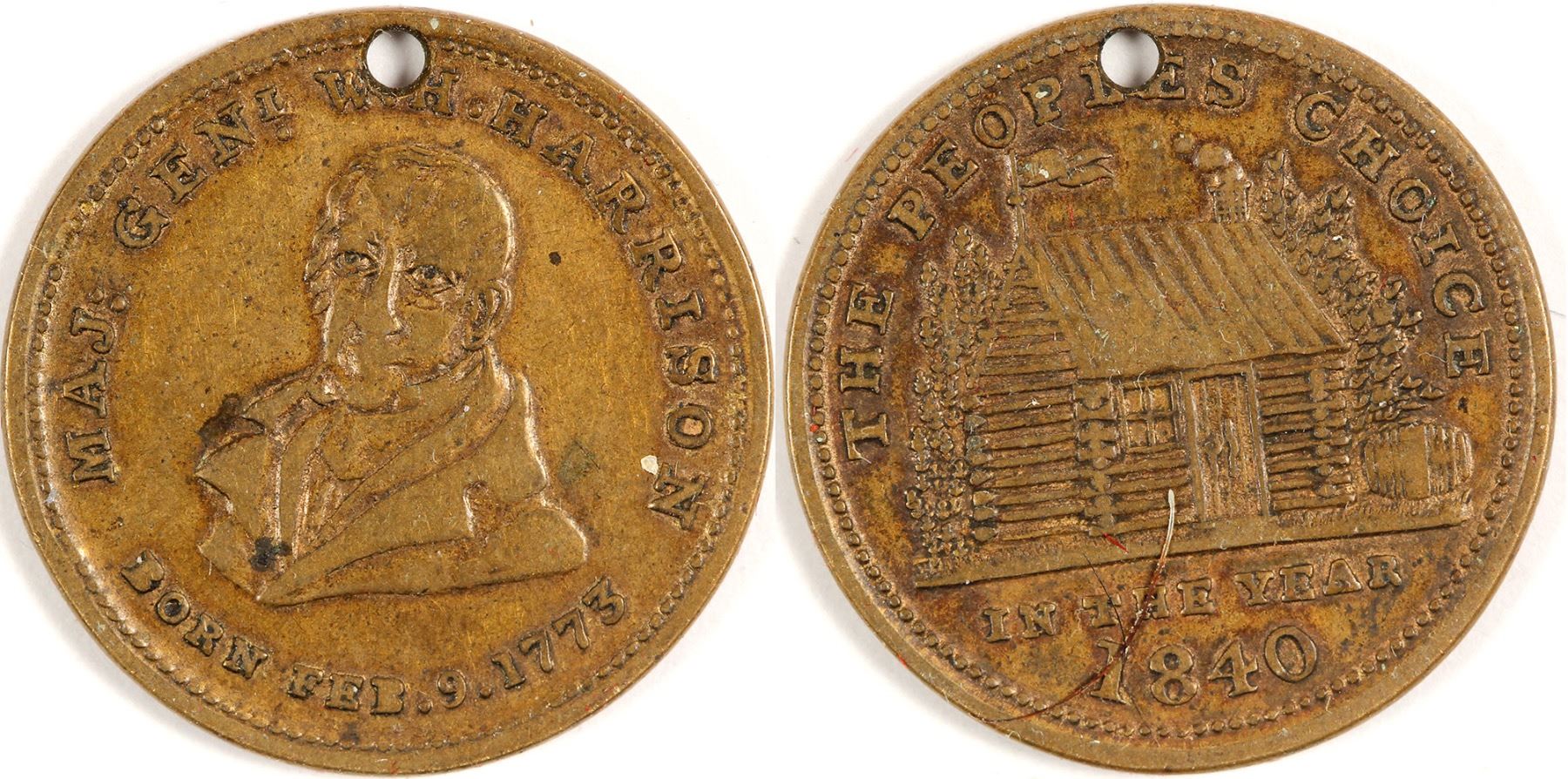 Obv.: Maj. Gen. Harrison / (portrait) / Born Feb. 9, 1773 ; Rev.: The People's Choice / (log cabin) / In The Year / 1840. Br., rd., 23 mm, holed. HWAC# 61900 Date: 1840 Location: