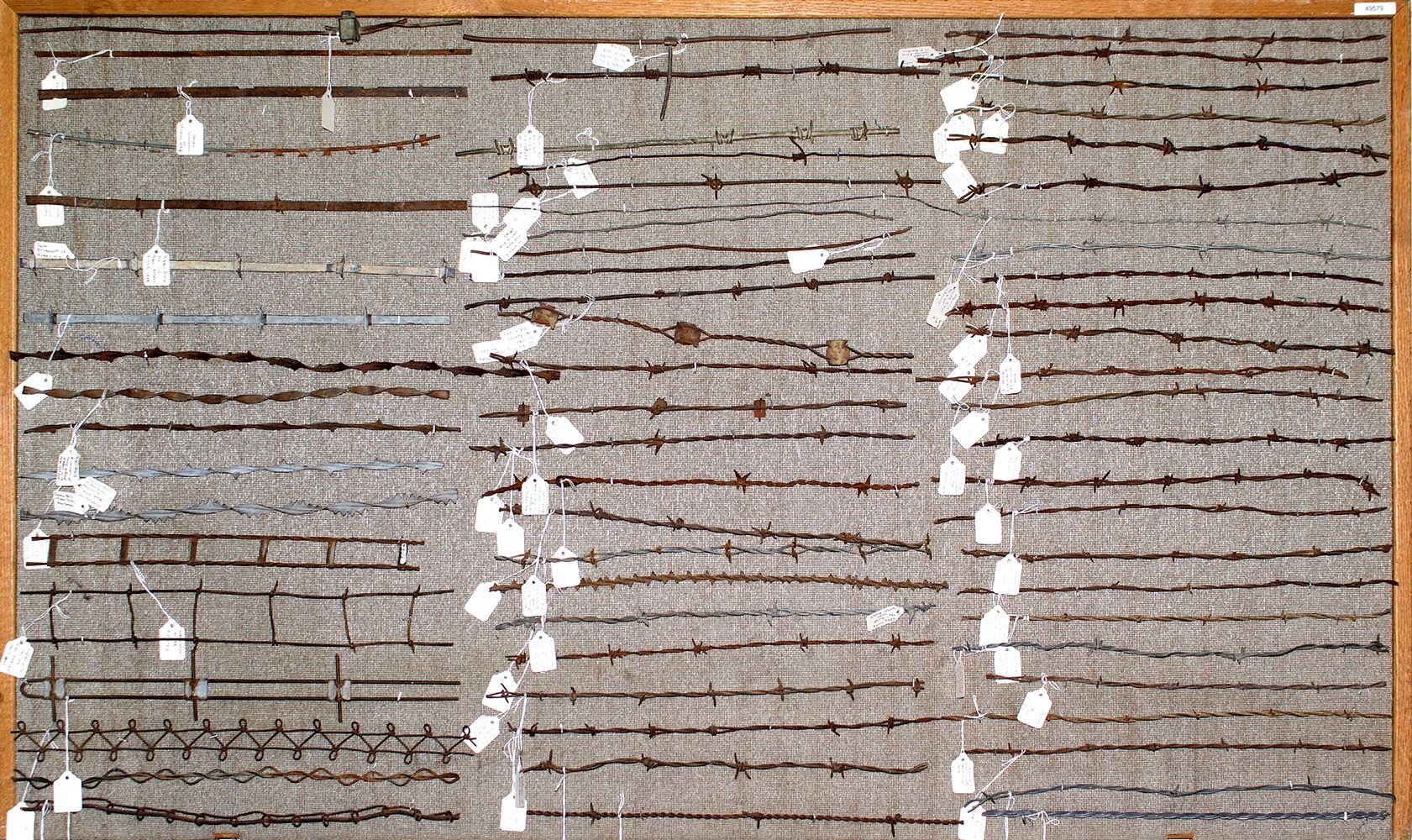 Major collection of 67 different barbed wires mounted on a 3' x 5' cloth covered board. Each is labeled with tag. This is easily the finest barbed wire collection we've ever handled, of the dozen or more collections over the past twenty years. Includes: Ladder wire No. 199, ladder wire no. 89; staywire, Ingraham ornamental; Cyrus Vosburg wire; Scott's H barb 263 and many, many more. Please inspect. State: City: Date: ID# 49579