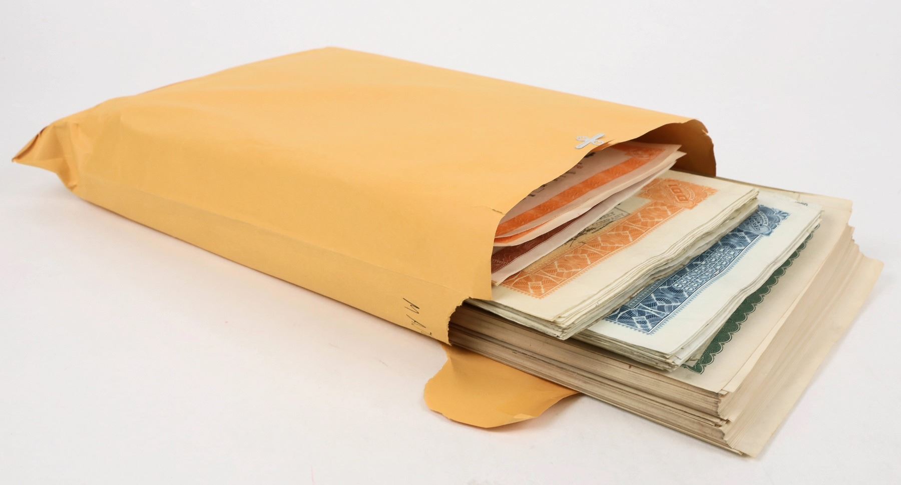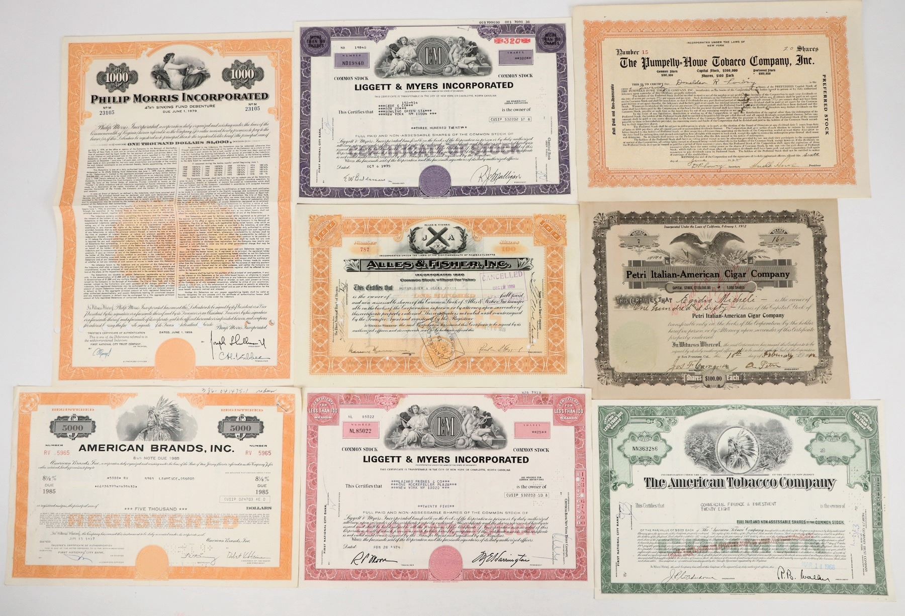 Major Tobacco Stock and Bond Inventory includes: Phillip Morris stocks and bonds, Lorillard, American Tobacco Company with an Indian vignette, American Brands, Petri Italian American Cigar, Green River Tobacco, R.J. Reynolds Tobacco, Union Cigar Company, Liggett & Meyers, Pompelly-Howe Tobacco (2 varieties), Alles & Fisher (2 varieties with crossed cigar vignette) c1920s. Various dates overall. 500-1000 pieces.