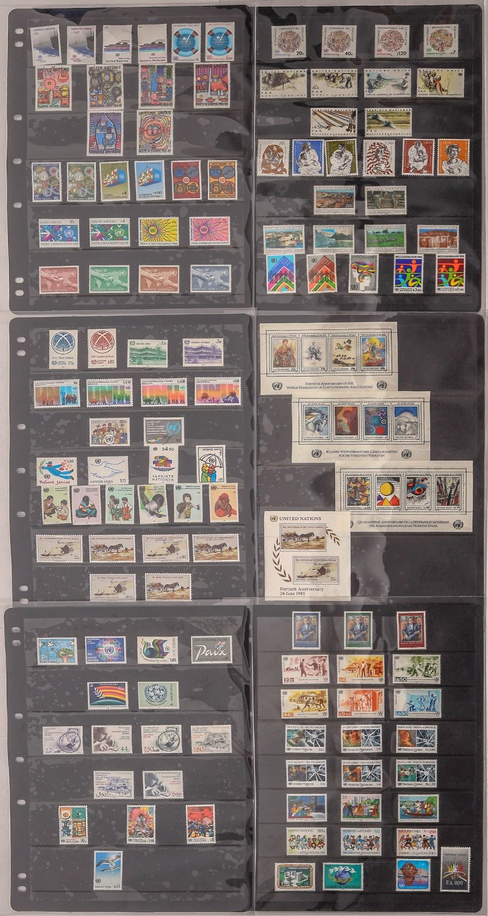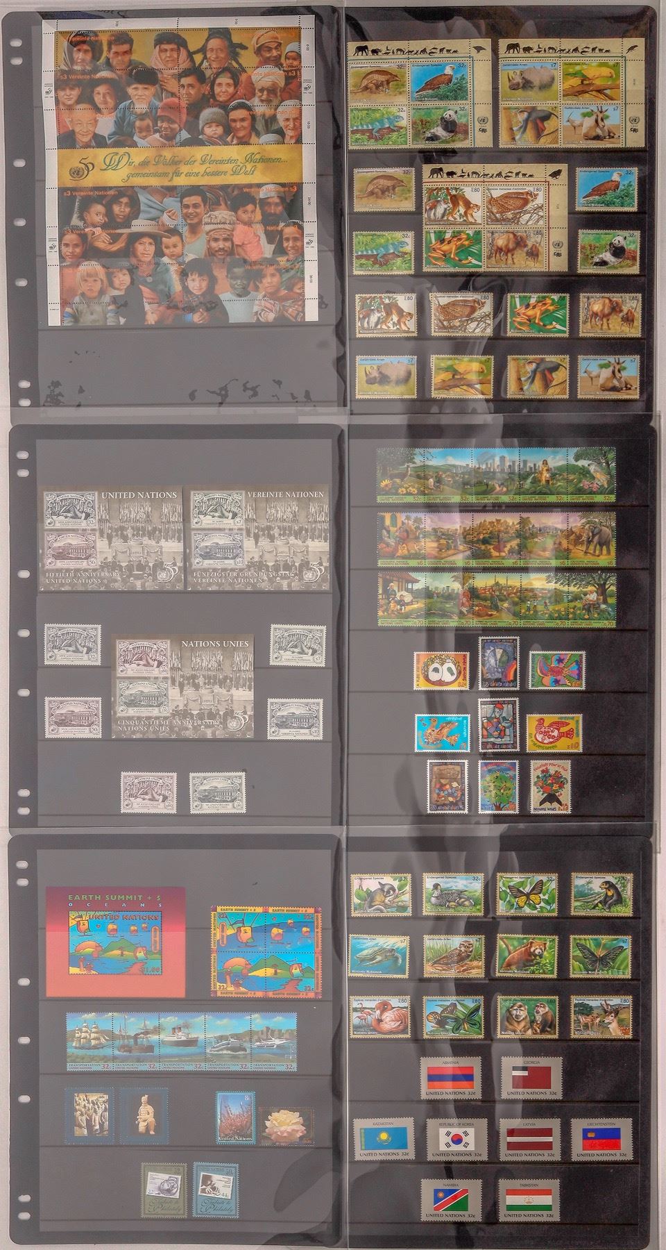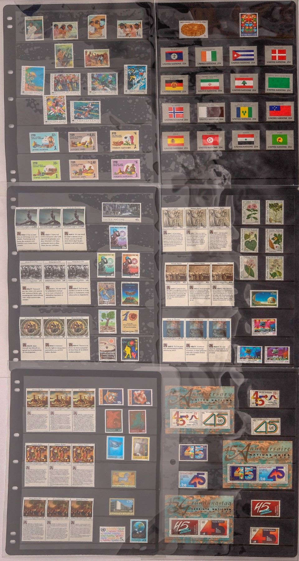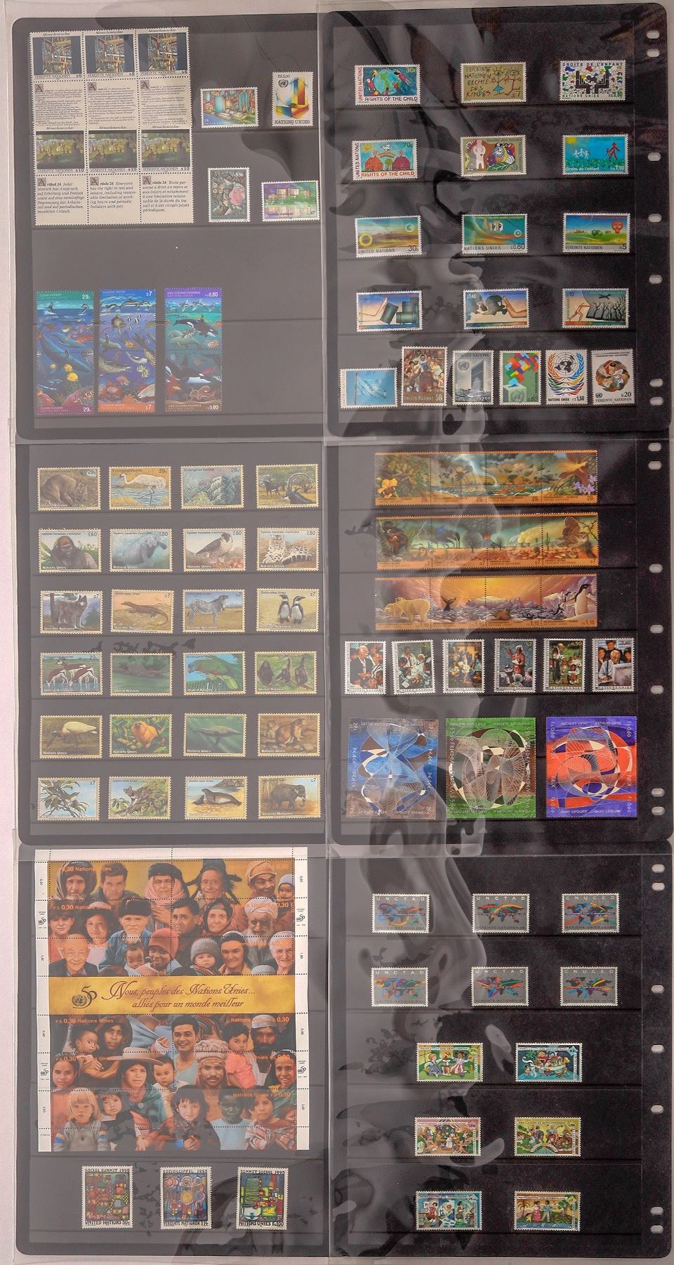 Major collection of United Nations stamps. First album, in slip cover, edited by Ben Blumentahl in 1971, beginning with the first regular issues in 1951 through 1969. Published by Minkus Publications of New York. The second binder, from the 1979 International Year of the Child, through 1995 with Leroy Neimans "sport and the environment" creations. Over 1000 stamps, all mint. Some covers, commemoratives. Over 30 prepaid postcards.