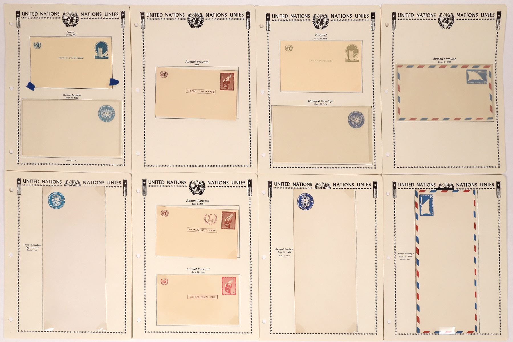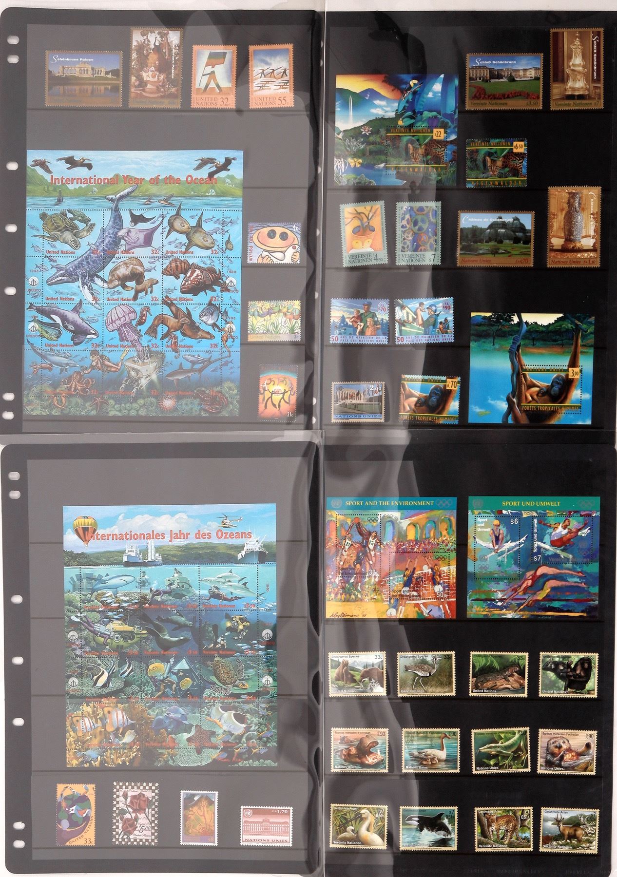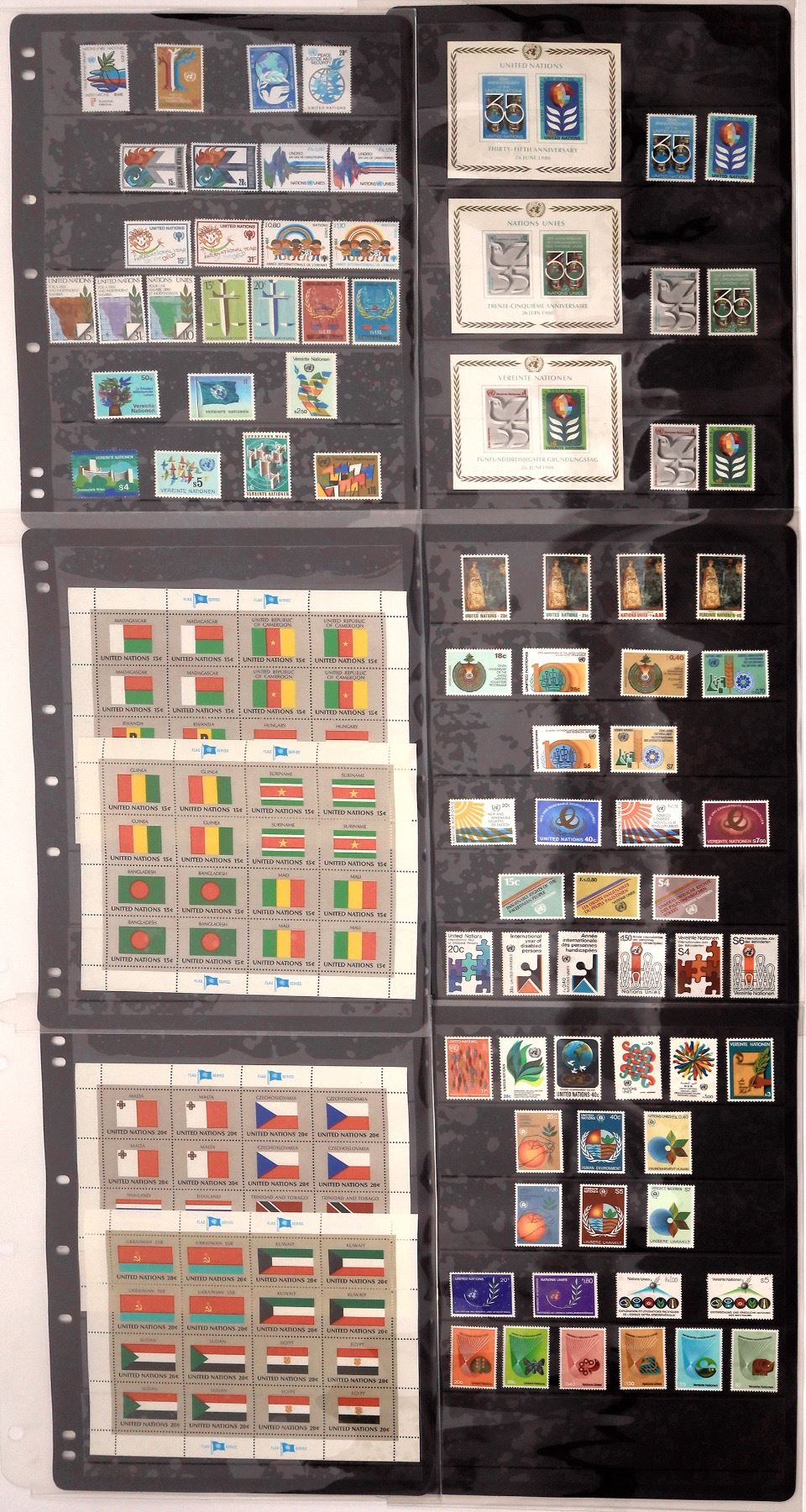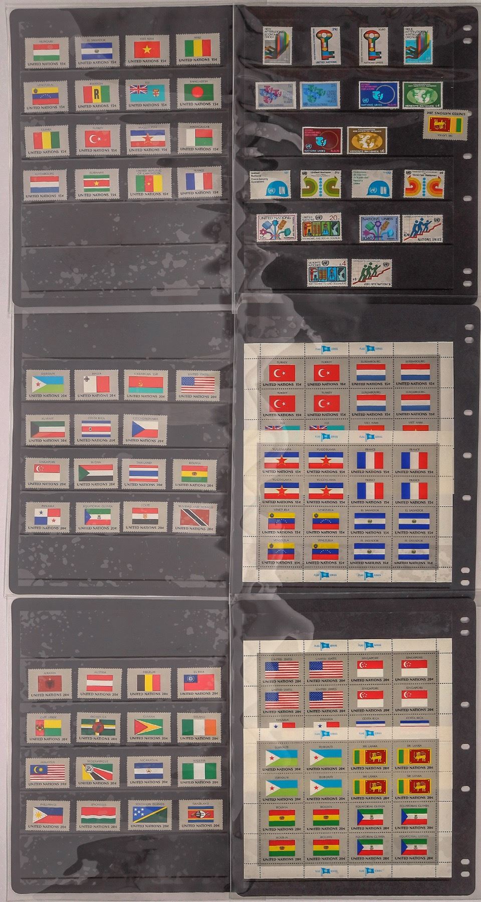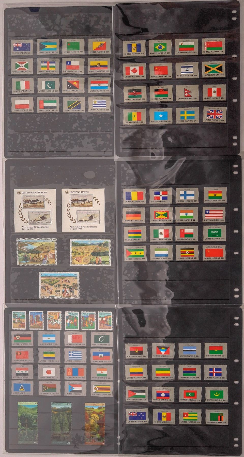Major collection of United Nations stamps. First album, in slip cover, edited by Ben Blumentahl in 1971, beginning with the first regular issues in 1951 through 1969. Published by Minkus Publications of New York. The second binder, from the 1979 International Year of the Child, through 1995 with Leroy Neimans "sport and the environment" creations. Over 1000 stamps, all mint. Some covers, commemoratives. Over 30 prepaid postcards.