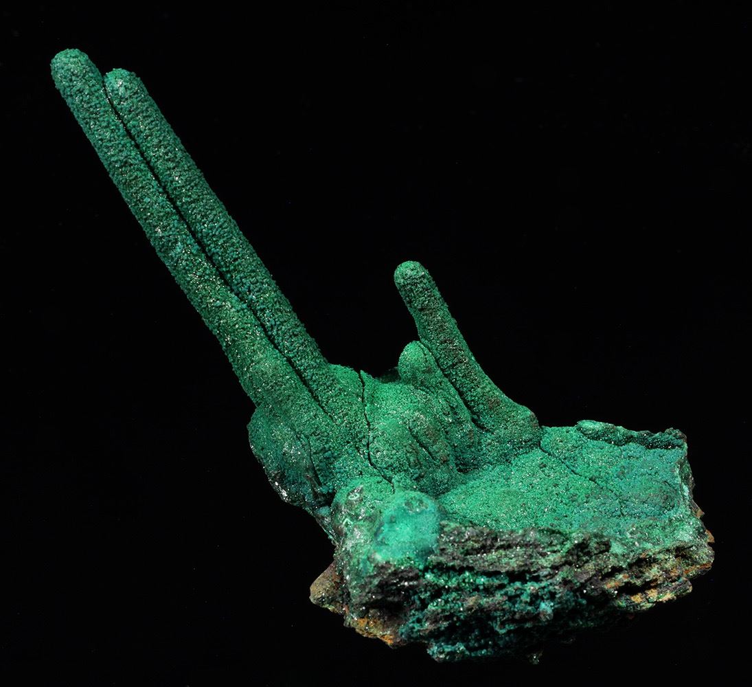 Malachite is a bright green copper carbonate hydroxide mineral which occurs in many crystal habits and forms. This fantastic specimen features long (7 cm), slender, stalactiform masses of medium green malachite. Malachite results from the weathering (oxidation) of copper ores. Open pit mining began at the Mashanba West Mine in 1978. This specimen was formerly in the private mineral collection of Uli and Anka Bahmann of Johannesburg, South Africa. Dimensions (cm): 7 H x 8 W x 5 D. Location: Mashamba West Mine, Kolwezi District, Katanga Copper Crescent, Katanga, Democratic Republic of Congo City: State: Democratic Republic of Congo Date: HWAC# 53069