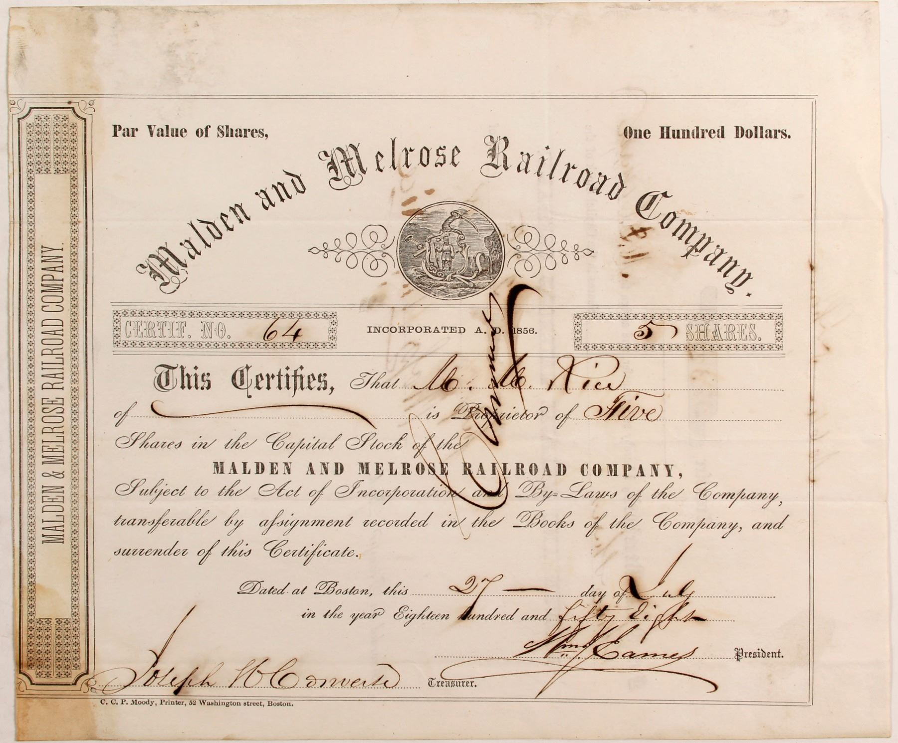 I/C #64 to Rice 5 shares. Signed by President Eames. An early horse drawn railroad incorporated in 1854. Left toning. Prag Collection.
