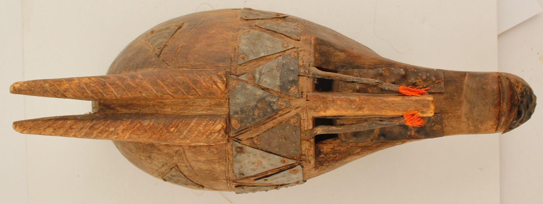 Carved wood mask with bottom handle and top horns. "The Marka are a Mande subgroup. This ethnic group is independent from the Bambara but their styles show a strong Bambara influence. The Marka are famous for their masks and puppets. Similar to Bambara's ntomo society masks, Marka masks are generally carved with horns, comb or crest on top of the head, but unlike Bambara masks they are often covered with metal sheeting. The Marka dress their masks in gaily-colored costumes made of cloth; they always appear in pairs, to represent man's courting of woman. Masks with a comb, similar to the ntomo masks of the Bambara, are danced in the context of adolescent boys’ initiation rites." from zyama.com 15x5.5"