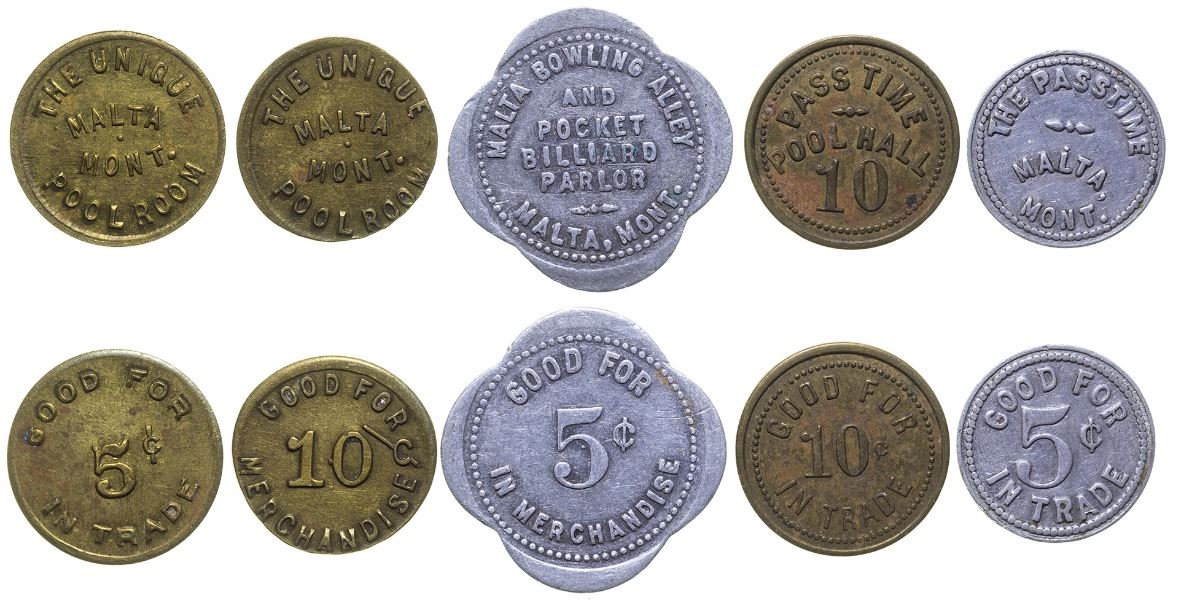 5 Different tokens from 3 different billiard halls including The Unique, Malta Bowling Alley and Pocket Billiard Parlor, and The Pastime. R-7 The Unique / Malta / Mont. / Pool Room // Good For / 5c / In Trade. Round, Brass, 21mm. R-7 The Unique / Malta / Mont. / Pool Room // Good For / 10c / Merchandise. Round, Brass, 21mm. R-6 Malta Bowling Alley / And / Pocket / Billiard / Parlor / Malta, Mont. // Good For / 5c / In Merchandise. Scalloped (4), Aluminum, 28mm. R-5 Pass Time / Pool Hall / 10 // GF / 10c / In Trade. Round, Brass, 21mm. R-4 The Pass Time / Malta / Mont. // GF / 5c / In Trade. Round, Aluminum, 20mm. City: Malta State: Montana, Date: Inventory# 39709
