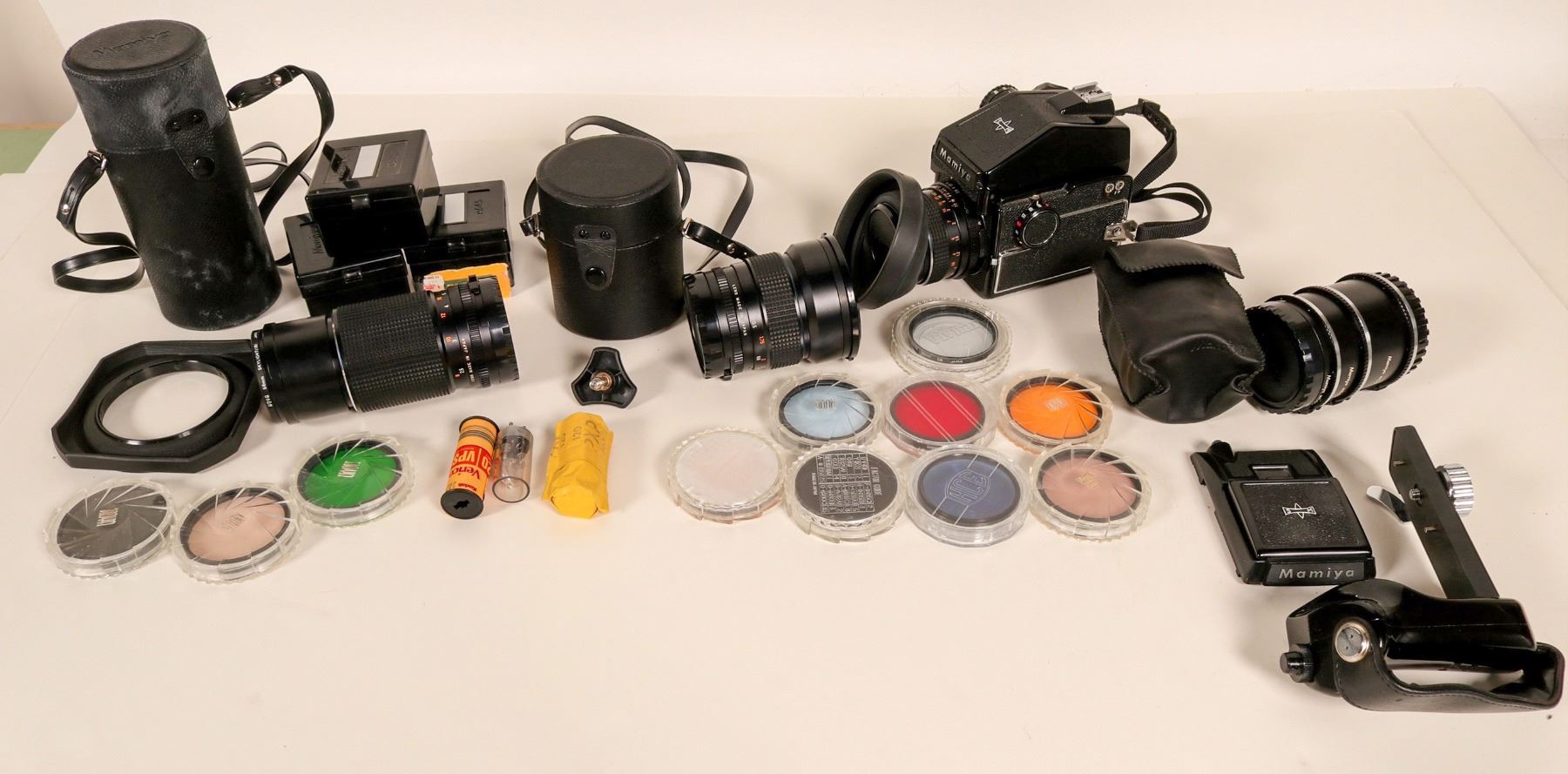 Zero Halliburton hardshell case, foam lined. Mamiya Sekor C 1:2.8 80mm (Ex+) with prism finder; Mamiya Sekor C 1:2.8 45mm lens (Ex++); Mamiya Sekor C 1:4 F210mm (Ex++); handle for camera, waist level finder, set of Mamiya auto extension rings 1,2,3; misc filters. City: State: Date: