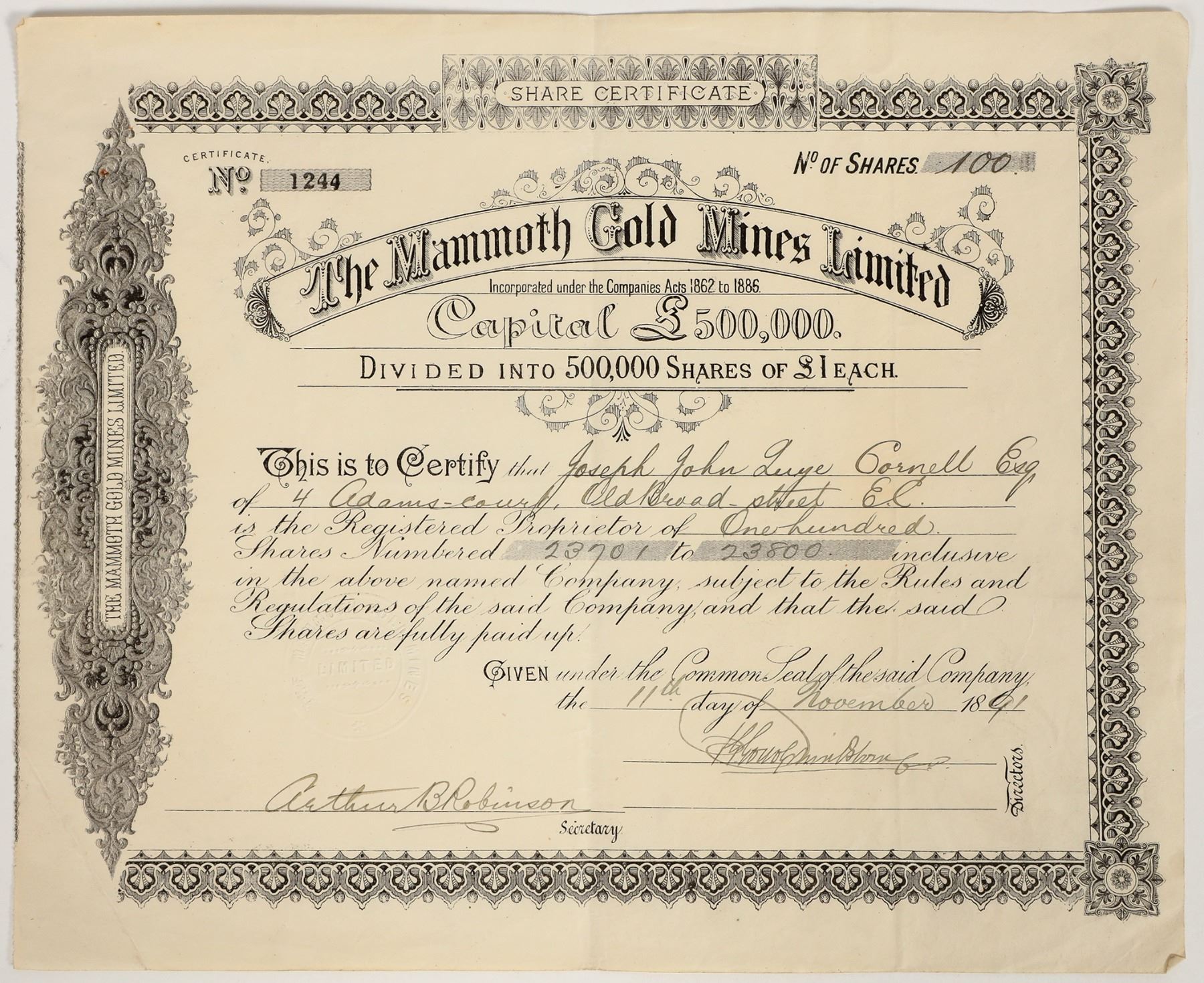 Rare stock no. 1244, issued for 100 shares in 1891. Not cancelled. 10.5 x 13" The Mammoth mine, discovered in 1870 in Pinal County, prompted the founding of the town of Mammoth three miles northeast of the mine. The mine was privately owned until this British company purchased it in 1889. The mine was worked profitably until 1893 when portions of it caved in. Three years this company sold the mine to a US company. Mammoth today has a few residents remaining, but the mine is closed. See Arizona Weekly Star, Thu., Mar 12, 1891, for a detailed article about this company and their eight claims in Pinal County.