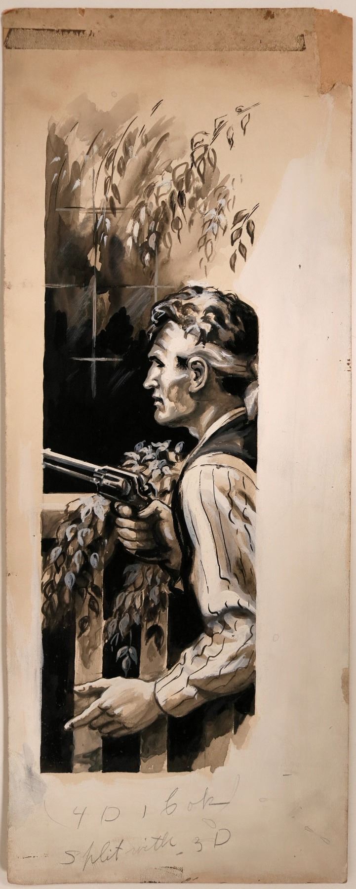 Partial illustration of man outside a yard holding a gun. Probably used with another illustration. Tempera/watercolor, 16" x 5".