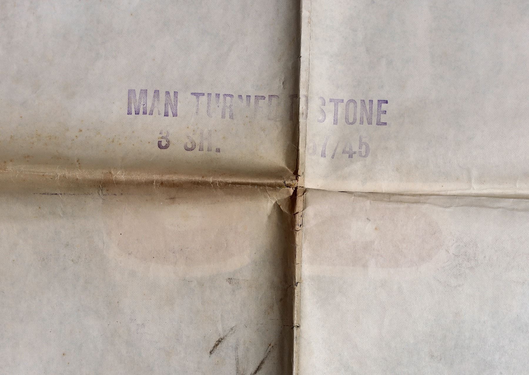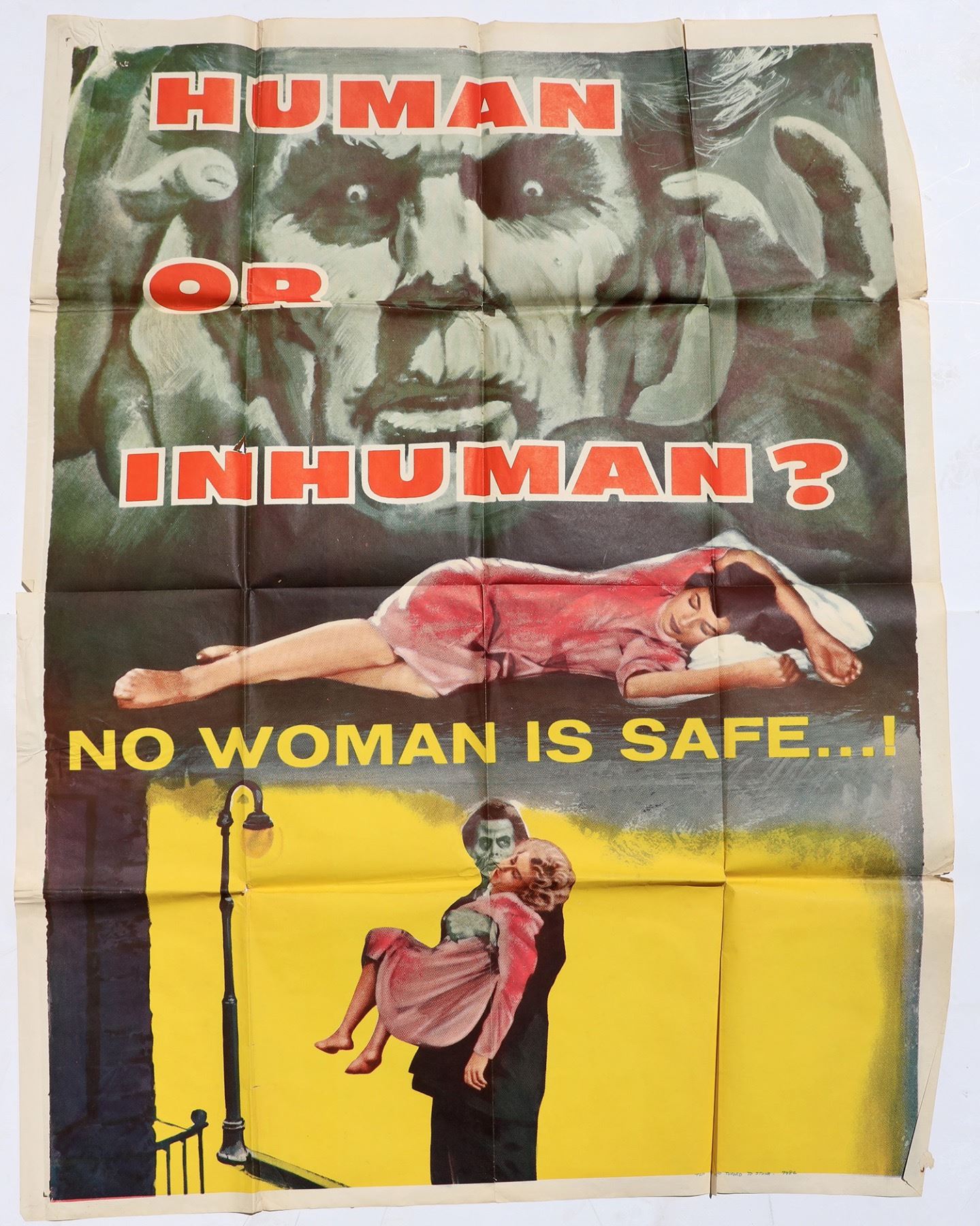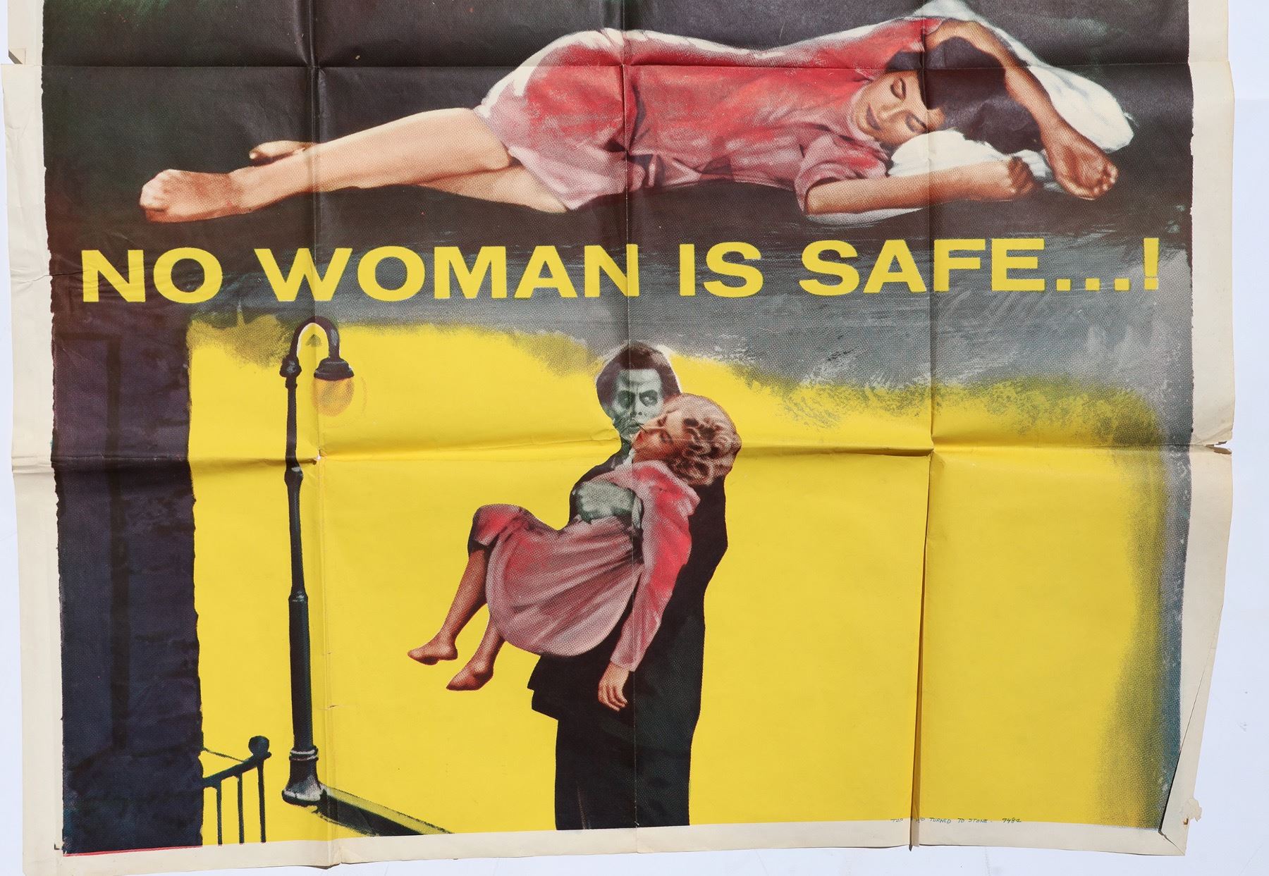 Sheet for science fiction chiller "The Man Who Turned to Stone" starring Victor Jory and directed by Laszlo Kordas and filmed in 1957. The plot centers around scientists who, in effort to become immortal, suck the life & energy from young women, using electricity. The poster has fold creases but are easily repaired.