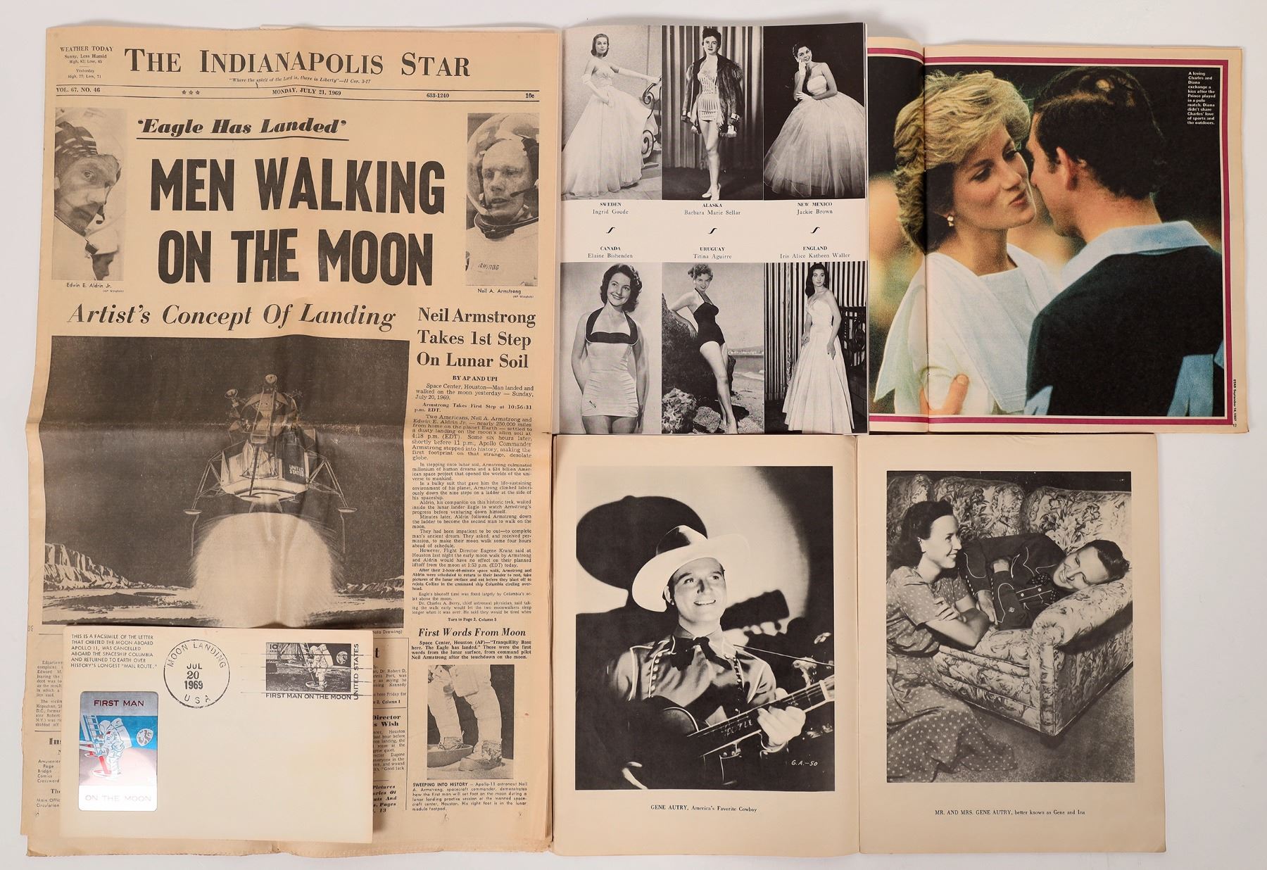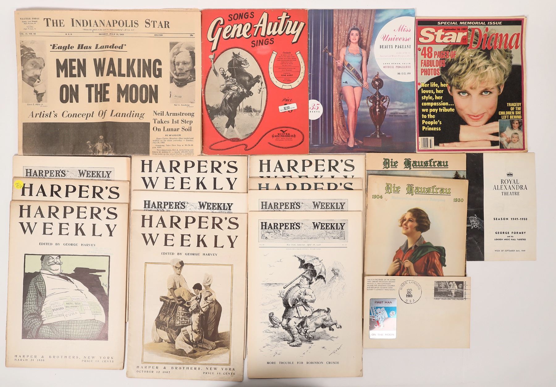 Harper's Weekly editions (8), a Gene Autry songbook, Princess Diana Memorial edition of Star Magazine, a July 29 issue of the Minneapolis Star announcing the moon landing & more. Please see photos for more details. 1800s-1900s