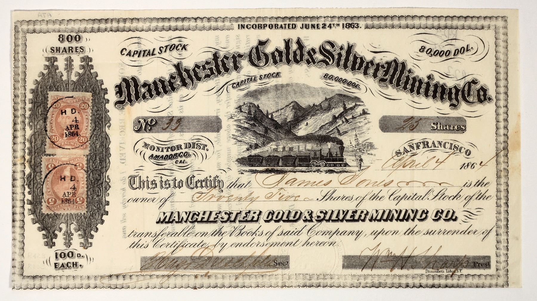 Very rare; we have no listings for this. Inc. June 1863. "Monitor Dist. Amador Co., Cal." printed to the left of detailed locomotive vignette. No. 33, issued for 25 shares to James Jones in April 1864 in SF. Signed by president Wm. Sharp and the secretary (illegible). Not cancelled. Two revenue stamps (20 and 5 cent). Folds, creases. 5.25 x 9.75" An early company which participated in the Silver Mountain boom, it operated a mile southwest of Loope, Monitor District, Alpine County.