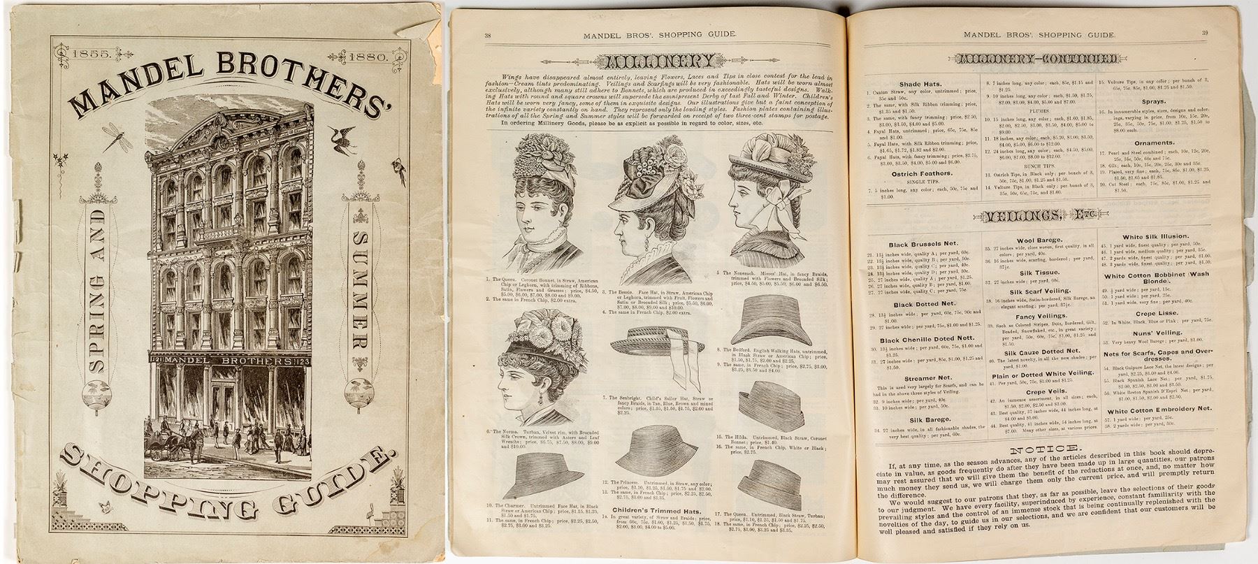 1880 Spring and Summer Catalog for the Mandel Brothers of Chicago established in 1855. The catalog has 66 black and white pages with a grey cover. The Mandel Brothers sold higher-end clothing and household goods and most pages are illustrated with drawings. Overall condition is good, with wear on the cover. Date: 1880 Location: Chicago, Illinois HWAC# 40138