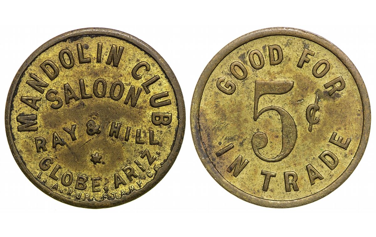 Obv.: Mandolin Club / Saloon / Ray & Hill / Globe, Ariz.; Rev.: Good For / 5c / In Trade; Br., 21mm,R7.