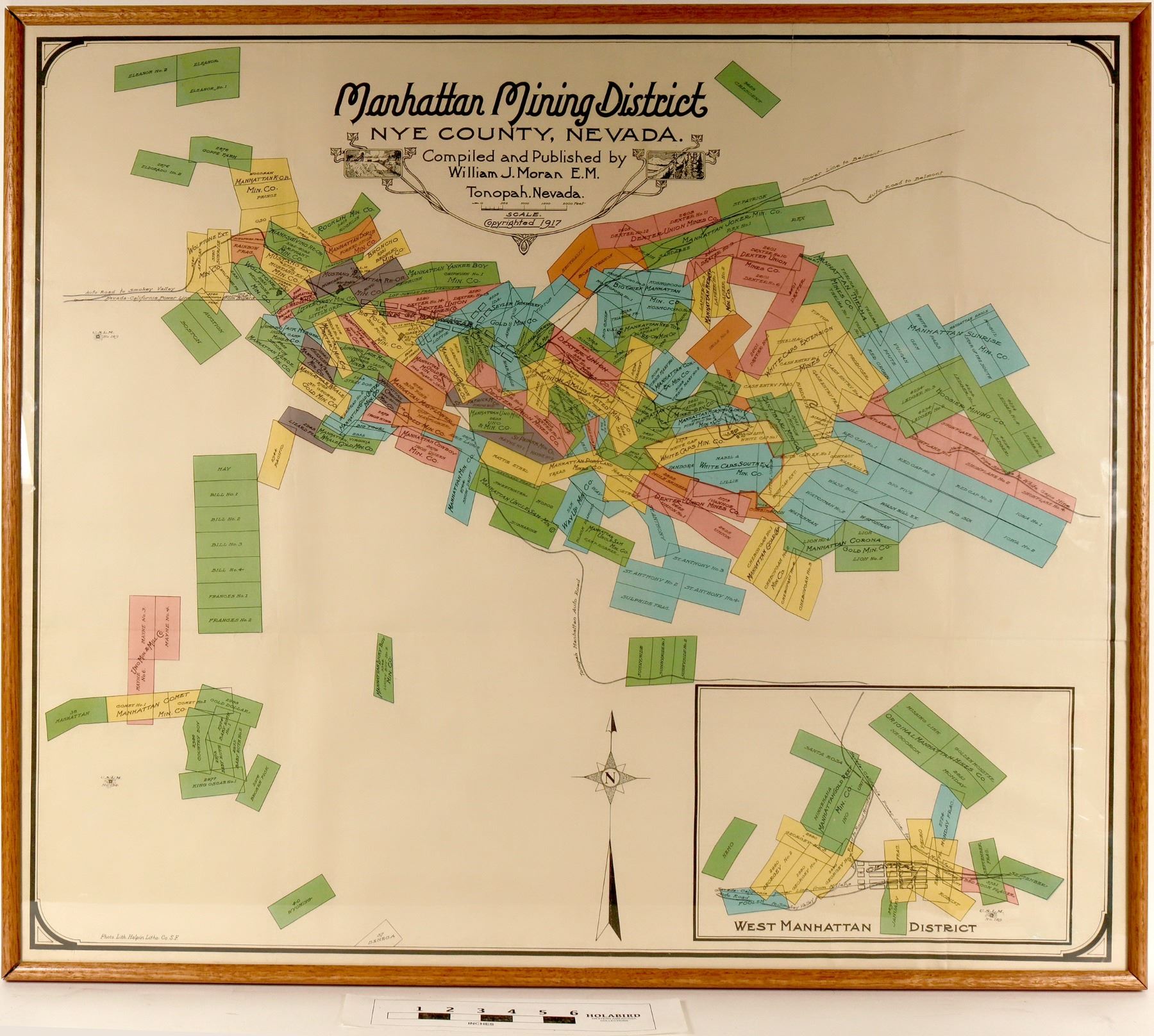 Manhattan Mining District, Nye County, Nevada. Compiles and Published by William K. Moran, E.M., Photo. Lith. Halpin Litho Co, S.F. This map is in such pristine condition as if it was mounted and framed on the day is was printed. There are no tears or water damage on this item, and the colors are bright and vibrant. It comes from a collector of the finest mining ephemera, and it has been professionally mounted and framed in oak and plexiglas. Dimensions are 38-1/4 x 32-3/4 inches. This will look spectacular on the wall of your home or office, or as a featured item in your museum.