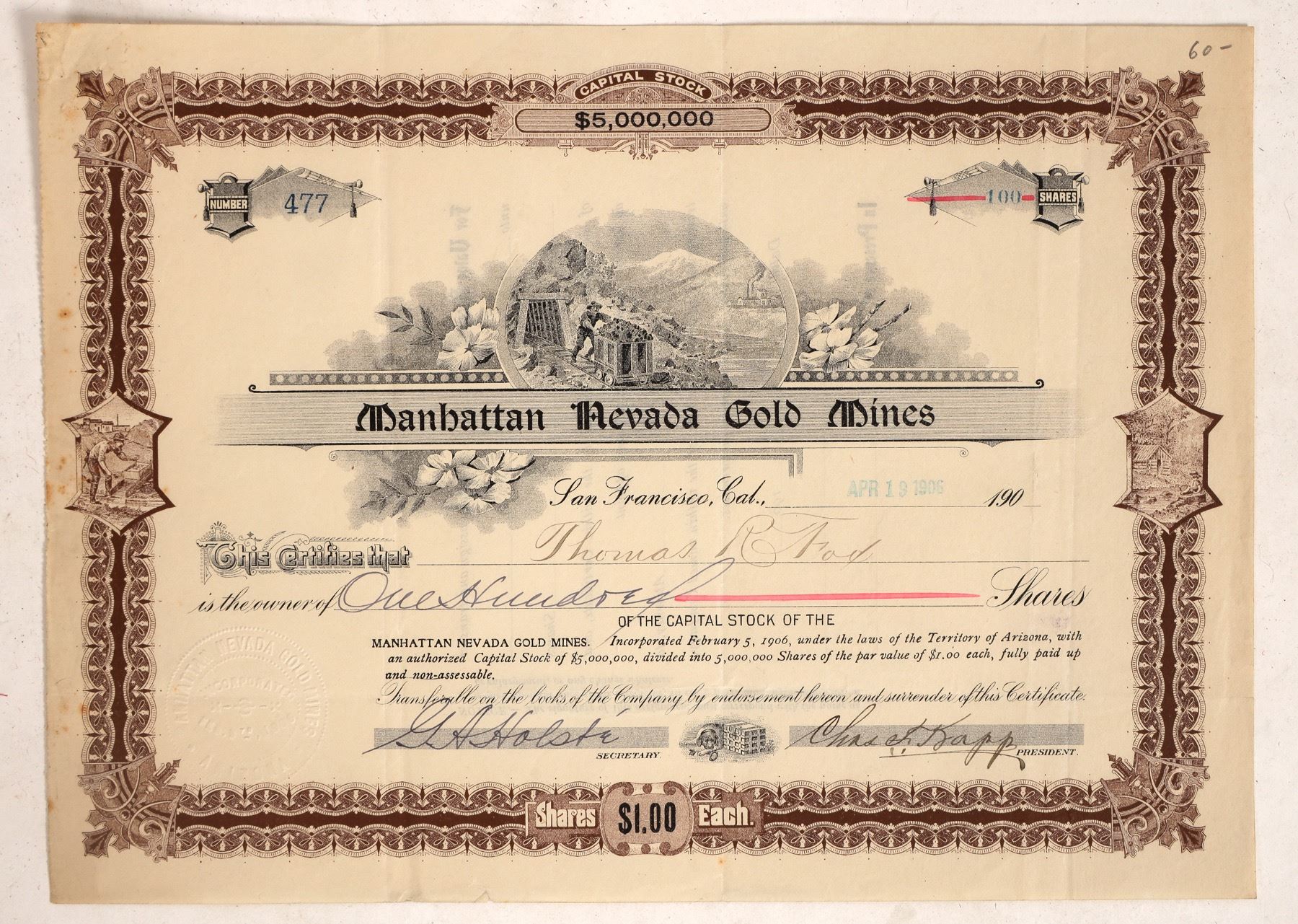 Rare issued 1906 Manhattan Nevada Gold Mines stock. [ Manhattan Nevada