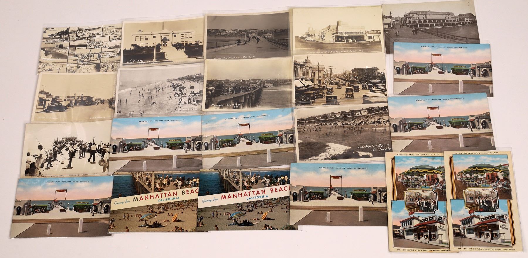 Lot of 21. we RPCs. Ad cards, wht borders. Six postmarked : Fullerton, Hermosillo Beach, Redondo Beach, Manhattan Beach, 1,2, 3 cent stamps. One card w/picas of all the L.A. beaches STREET LEVEI: Business Dist. . Redondo(1915C), Manhattan Pier Fishing , Manhattan Business Dist., State:California City:Multi Date:1924-56 Provenance: Ken Prag Collection