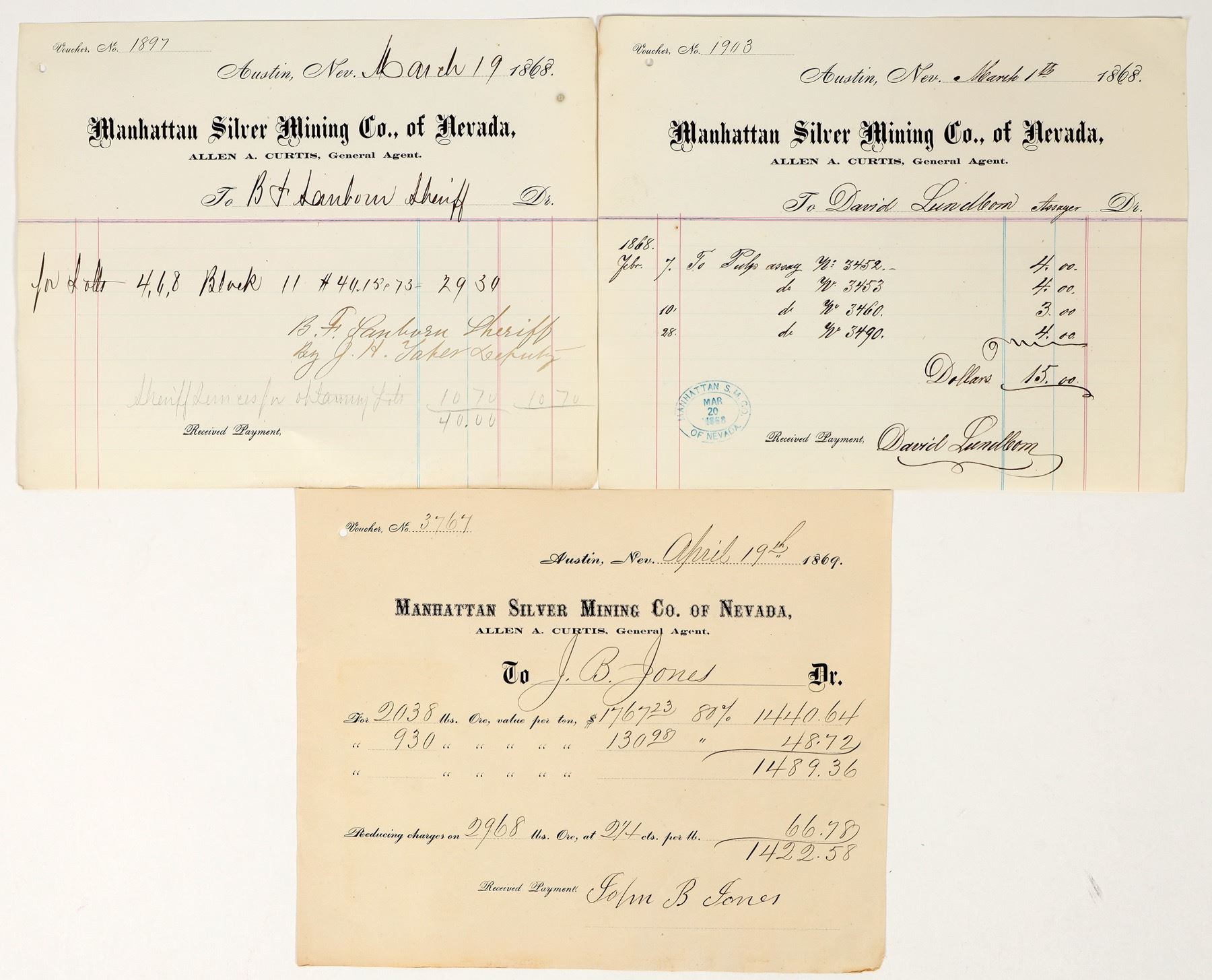 Lot of 3 different. 1868 issued to David Lundbom, assayer. 1868 issued to BF Sanborn, sheriff. And 1869 to John B. Jones.