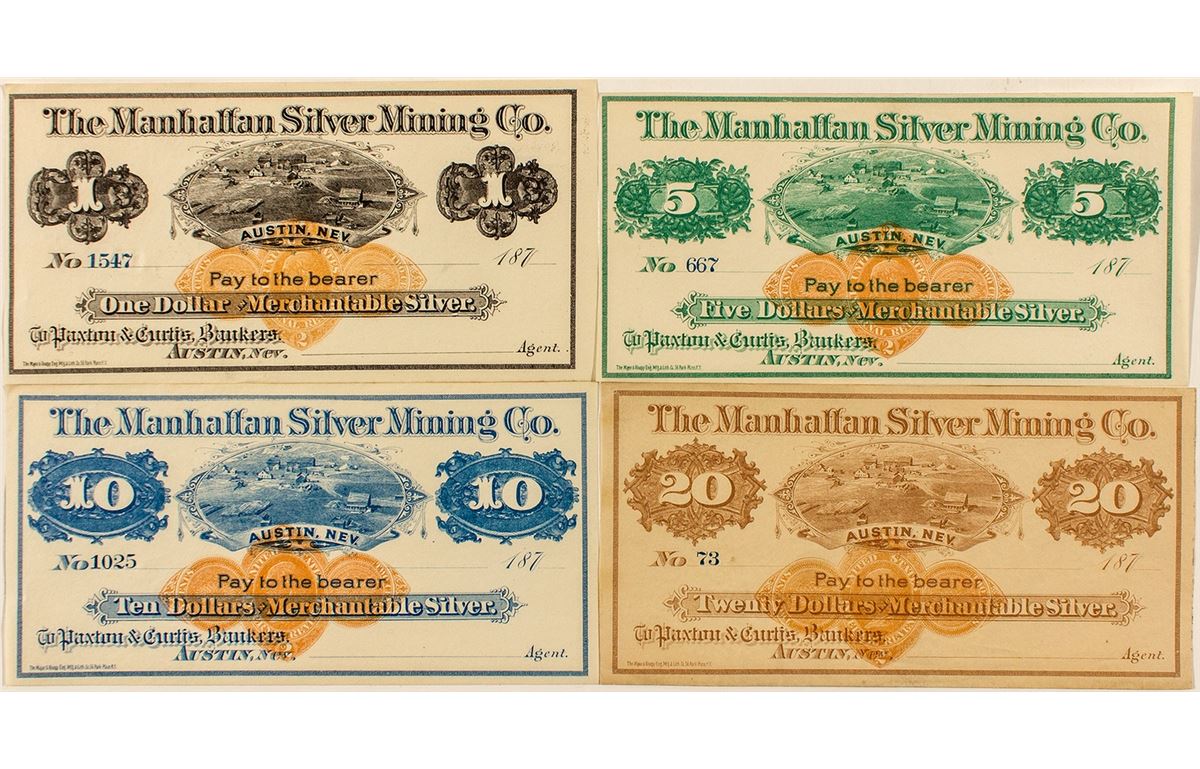 Four unissued pictorial scrip of different denominations for the Manhattan Silver Mining Company. $1 (black), $5 (green), $10 (blue), and $20 (brown). Vignette of mining facility. RN-D. Crisp. (Prag Collection)