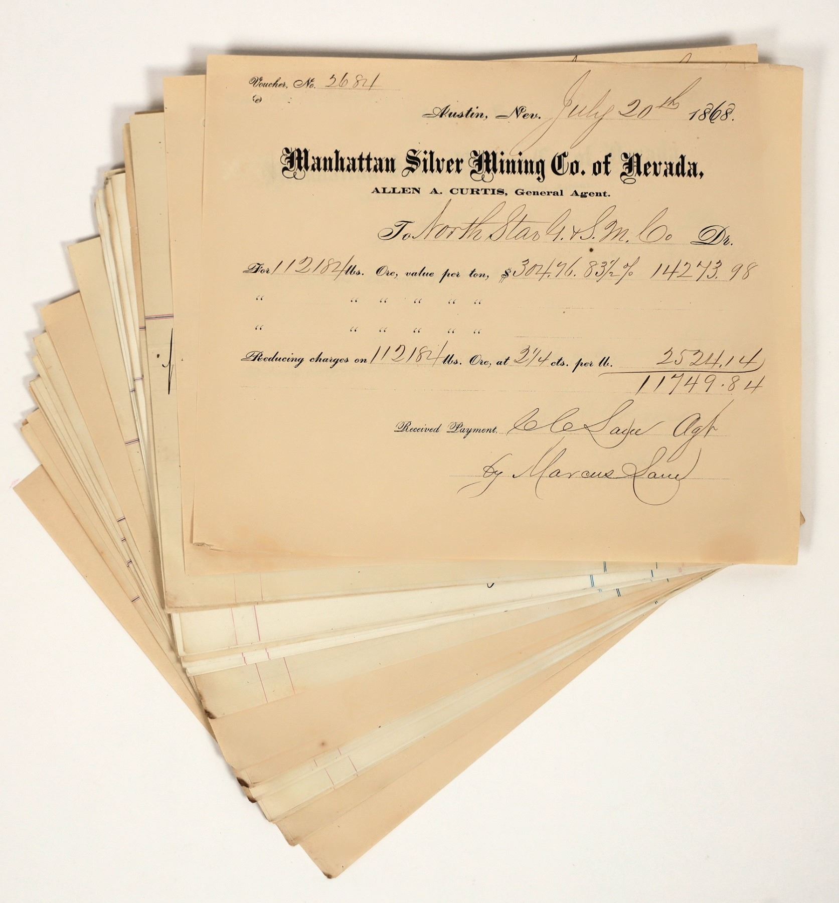 Lot of about 30 billheads issued in 1868. Some are ore assay result billheads. All list Allen A. Curtis as agent. In 1865, the Manhattan Silver Mining Co. consolidated many holdings and built a mill. By 1871, the company controlled nearly all the mines and produced until 1887. Through 1887, the company produced $19.2 million in silver (Paher, Nevada Ghost Towns and Mining Camps).