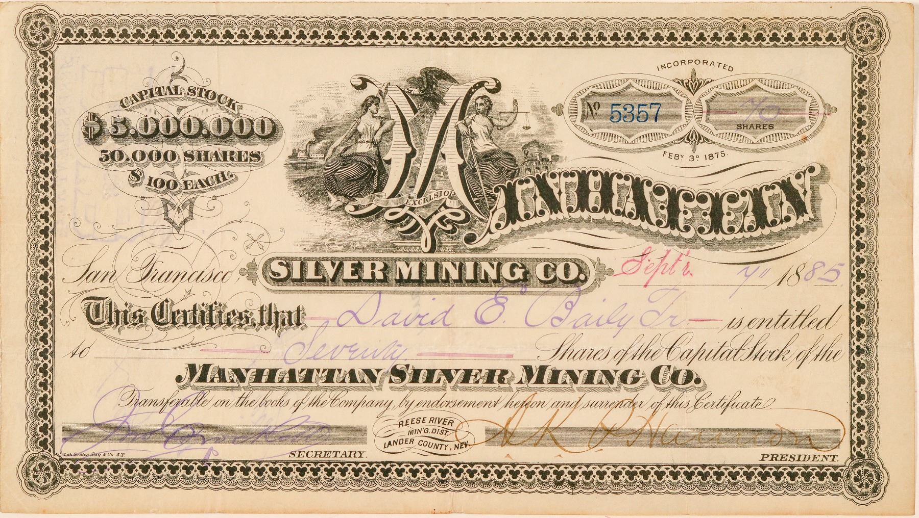 Rare stock for this important Austin mining company. "Reese River Mining Dist., Lander County, Nev." printed at bottom center. Inc. Feb. 1875. No. 5357, issued for 70 shares to David E. Baily on Sept. 7th, 1885. Signed by president A.K.P. Harrison and secretary John Crockwell. Not cancelled. Black border and print. Very fancy logo with allegorical imager (women, eagle, train) wrapped around the letter "M." Printed by Britton & Rey. 5.25 x 9.5" Folds, pinholes, creases. Ken Prag Collection