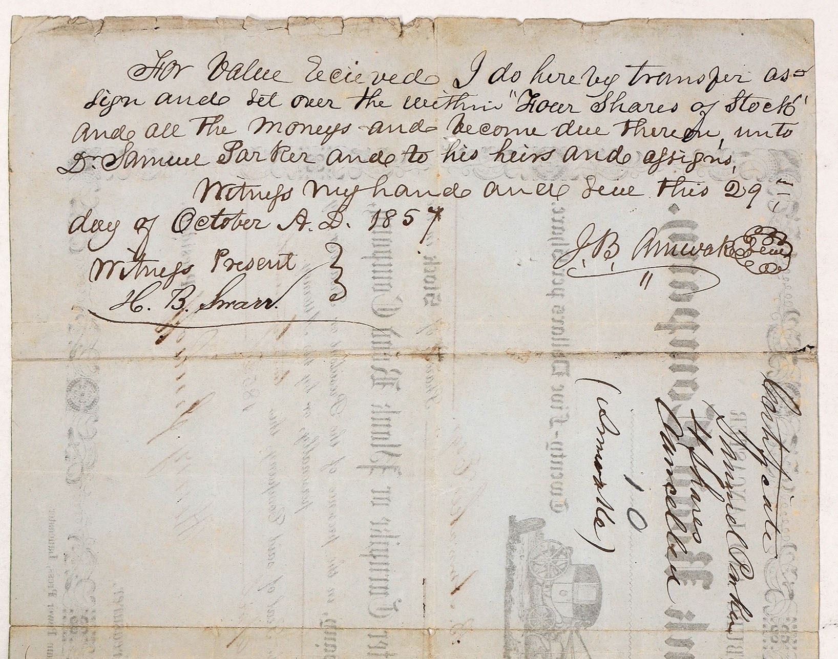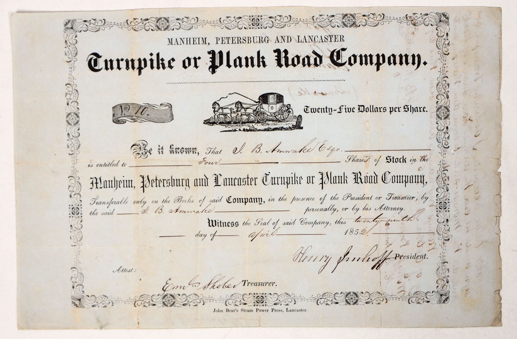 Issued 1852 Manheim, Petersburg and Lancaster Turnpike or Plank Road stock. Coach vignette. Some toning and right edge degradation. Please inspect.
