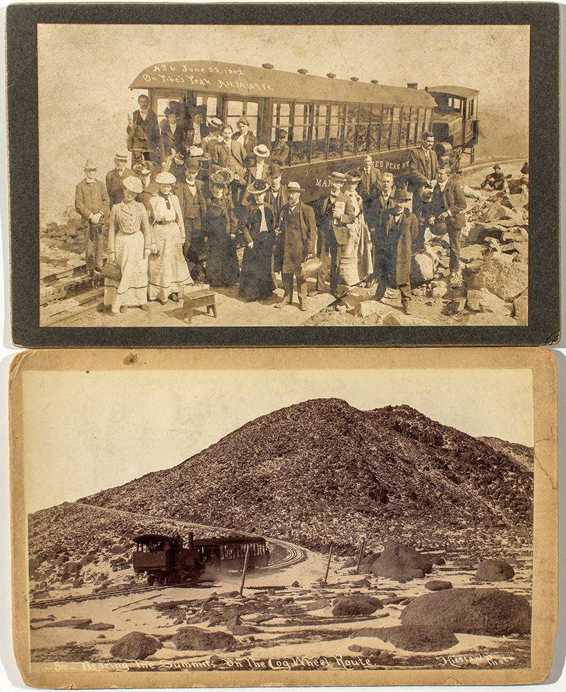 Two nice mounted cabinet photos circa 1902 by J.G. Hiestand, the railway's official photographer. First photo show a group at the summit, at 14,147 ft. altitude. Dated June 22, 1902 on the photo. Photo 2 is titled, "Nearing the Summit, On the Cog Wheel Route. Both mounts measure 8" x 5" with the photos slightly smaller. Both photos clearly identify Hiestand as the photographer on the front or the back. Great period pieces.